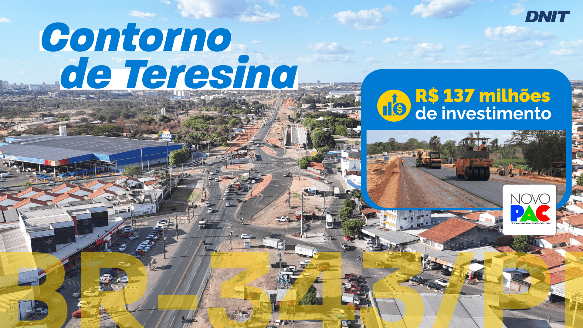 Com a finalidade de proporcionar mais fluidez e segurança ao tráfego da BR-343/PI, o Departamento Nacional de Infraestrutura de Transportes (DNIT) avança na implantação do Contorno Rodoviário de Teresina. As obras de adequação da rodovia vão melhorar o tráfego de entrada e saída dos cerca de 42 mil veículos que circulam diariamente pela via. O empreendimento conta com investimento previsto de aproximadamente R$ 137 milhões do Governo Federal e está 36% executado.