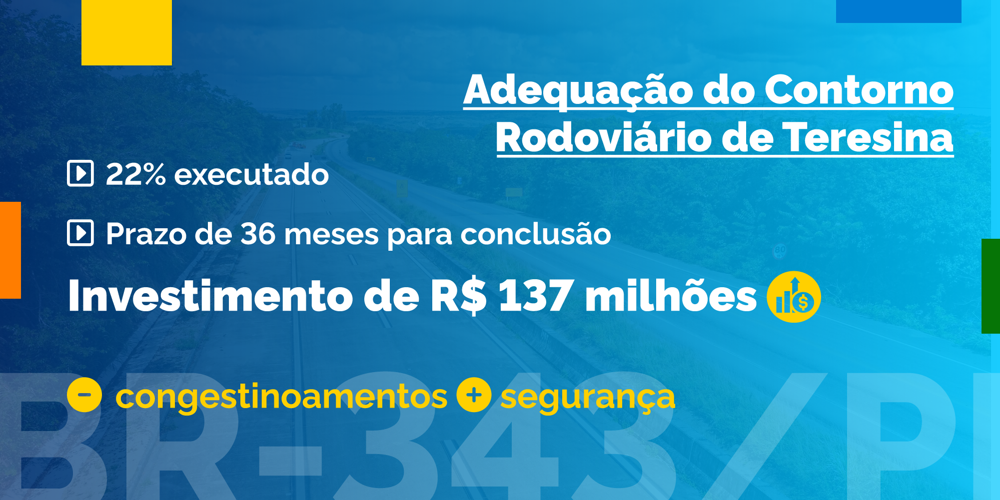 As obras de adequação, duplicação, melhoria e restauração que o Departamento Nacional de Infraestrutura de Transportes (DNIT) está executando na BR-343/PI, no Contorno Rodoviário de Teresina, darão mais fluidez e segurança e facilitarão a chegada e a saída dos mais de 42 mil veículos que trafegam pela via diariamente.