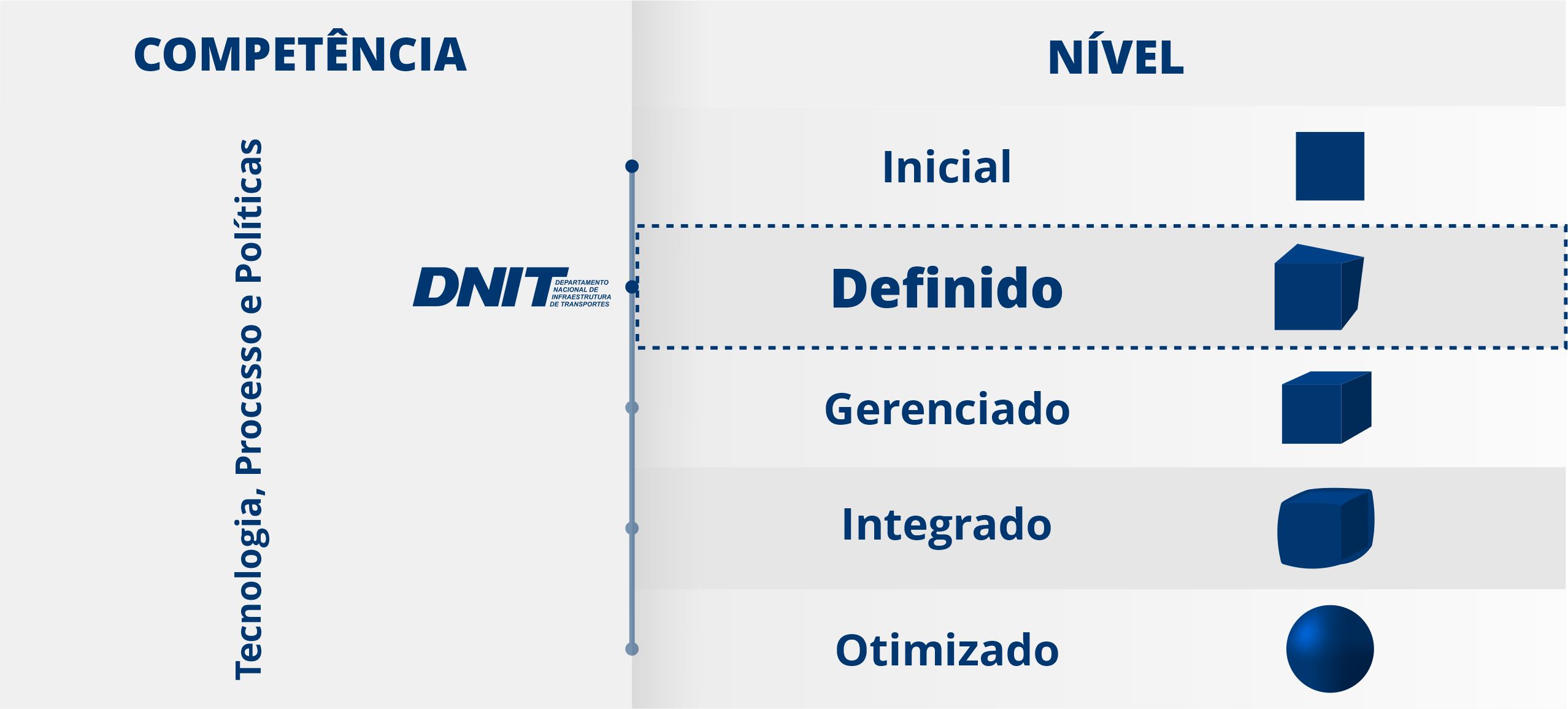 Sendo assim, com base nas ações realizadas pelo Núcleo BIM do DNIT e após a avaliação dos dados da Pesquisa de Maturidade, realizada em 2021, a autarquia apresentou um avanço significativo de maturidade passando de inicial para o nível definido de maturidade.
