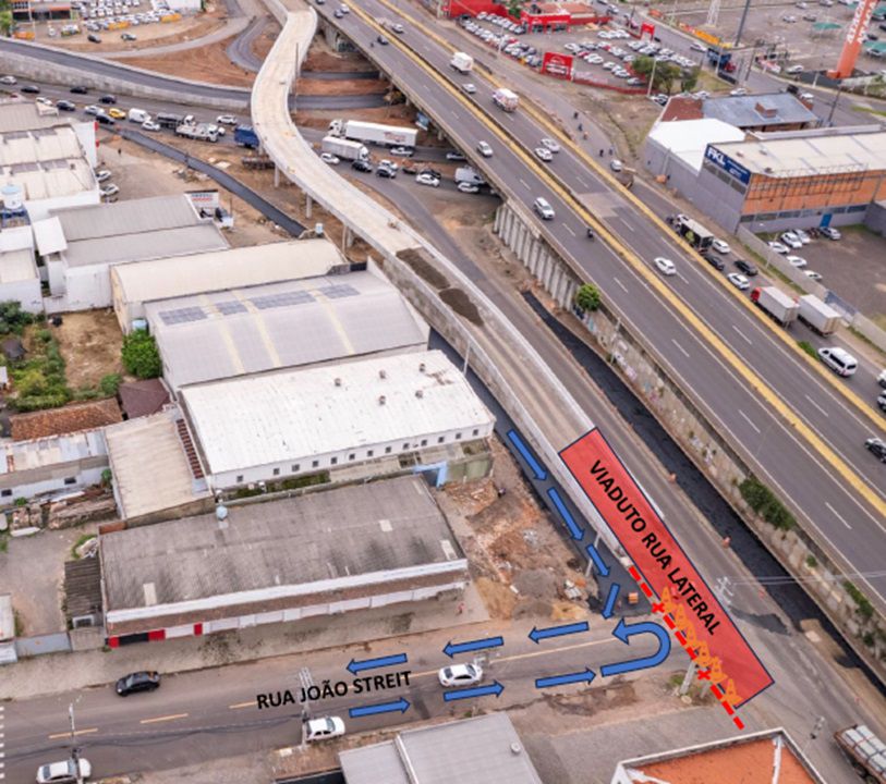 Para os motoristas que vêm pela rua lateral ao viaduto e desejam entrar à direita na Rua João Streit, essa manobra seguirá normalmente.