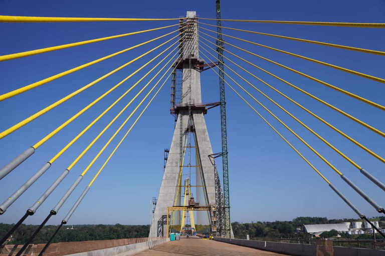 Neste mês, os dois lados da Ponte de Integração Brasil-Paraguai foram conectados com a instalação da última aduela (peças metálica que compõe a base da futura pista de rolamento).