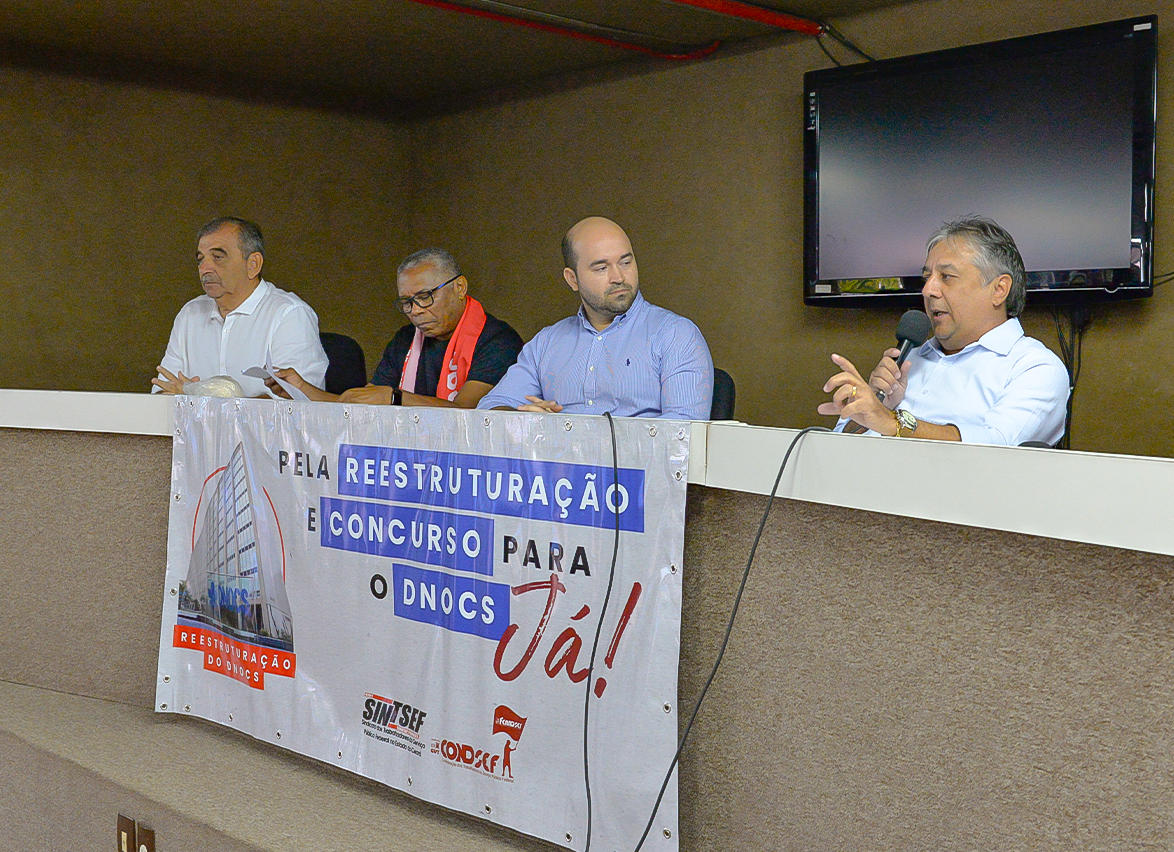 Representando o Diretor-Geral do DNOCS, Fernando Leão, estiveram presentes o Diretor de Produção e Desenvolvimento Tecnológico da Autarquia, Allan Galvão, e o Diretor Administrativo do DNOCS, Narcélio Albuquerque. Na pauta da reunião, a importância da reestruturação e realização de um concurso público na Autarquia. O encontro contou com servidores dos estados de Alagoas, Bahia, Ceará, Maranhão, Paraíba, Pernambuco, Piauí, Rio Grande do Norte, Sergipe, e o norte de Minas Gerais.