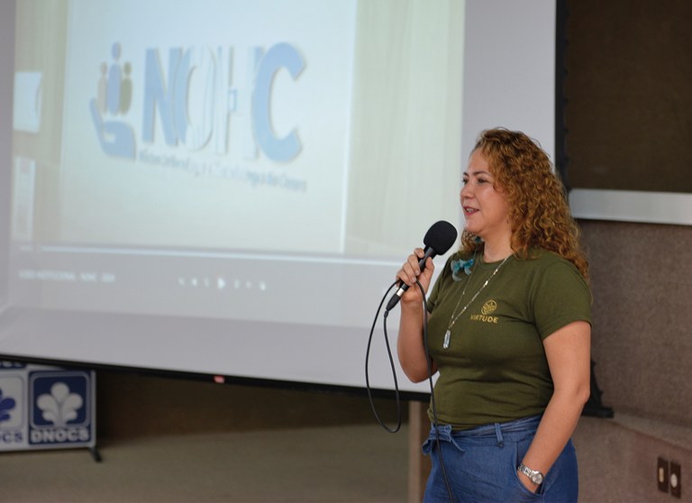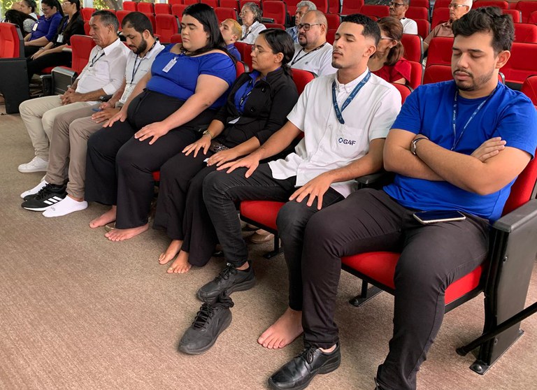 Em seguida, a terapeuta integrativa Francilene Ferreira conduziu uma dinâmica de relaxamento para os participantes, proporcionando uma pausa para o autocuidado e o equilíbrio emocional. Fazendo com que os participantes entendessem mais sobre meditação e consciência corporal.
