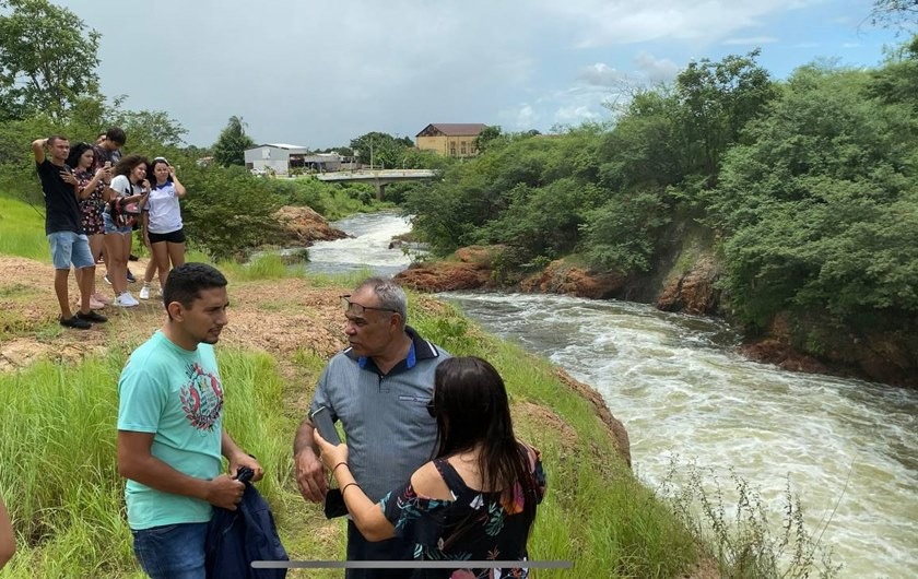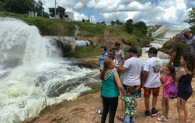 Turistas contemplam a beleza de açude que sangra