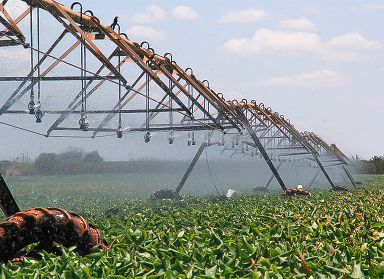 - Pivô central com microaspersão: neste sistema, a irrigação é realizada por meio de uma torre, com uma estrutura suspensa que gira de forma circular para a parte superior da plantação. Uma tubulação joga a água em cima da planta, por meio de microaspersão, evitando desperdício de água.