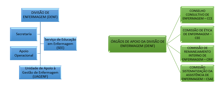 - Órgãos de apoio: Comissão de Remanejamento Interno de Enfermagem (CRIE), Comissão de Ética em Enfermagem (CEE), Conselho Consultivo de Enfermagem (CCE) e Comissão de Sistematização da Assistência de Enfermagem (CSAE).