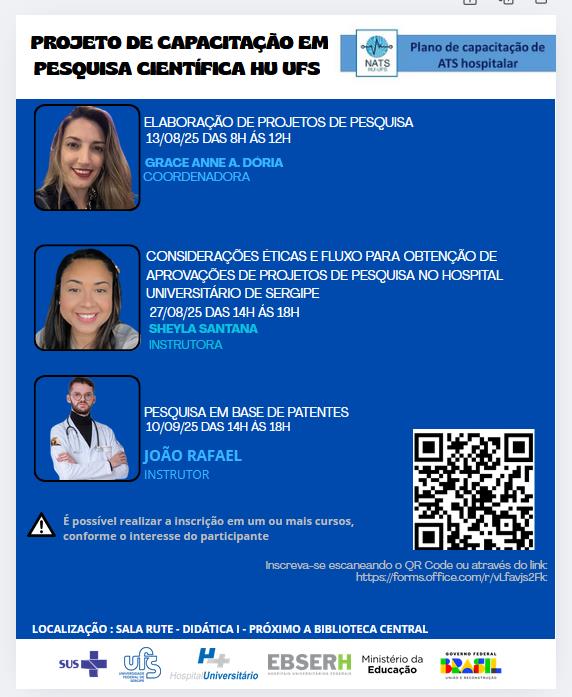 Este espaço é dedicado a divulgar oportunidades de capacitação oferecidas tanto pelo NATS do HU-UFS quanto por outras instituições renomadas envolvidas com a Avaliação de Tecnologias em Saúde (ATS).