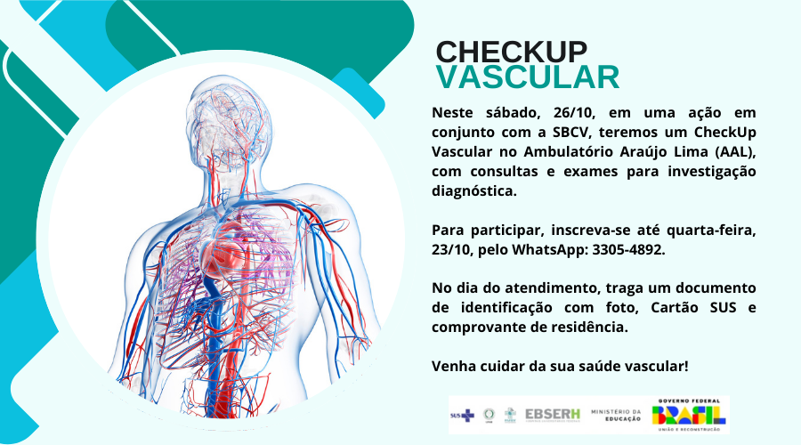 Já no dia 26/10, sábado, será o dia do Checkup Vascular, com previsão de atendimentos ambulatoriais de 150 pacientes oriundos da fila da regulação do estado no Ambulatório Araújo Lima do HUGV-Ufam. Na oportunidade, além da consulta por profissionais especialistas do hospital, será realizado o exame de ultrassonografia para investigação diagnóstica.