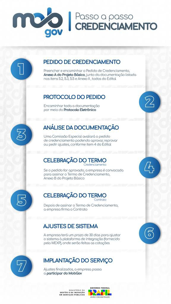 A presente página trata das instruções procedimentais de como as empresas prestadoras, agenciadoras e/ou intermediadoras de serviços de transporte terrestre poderão se credenciar ao sistema MobGov. Toda a documentação está disponível nesta página.