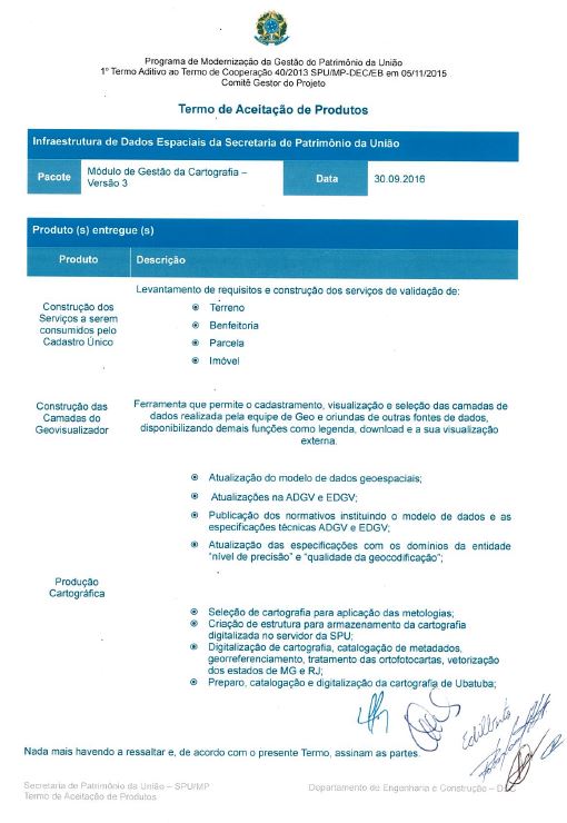 Termo de Cooperação para Descentralização de Crédito nº 40, firmado com o Departamento de Engenharia e Construção – DEC do Exército Brasileiro, para o Desenvolvimento da Infraestrutura Geoespacial do Programa de Modernização da Gestão do Patrimônio Imobiliário da União.