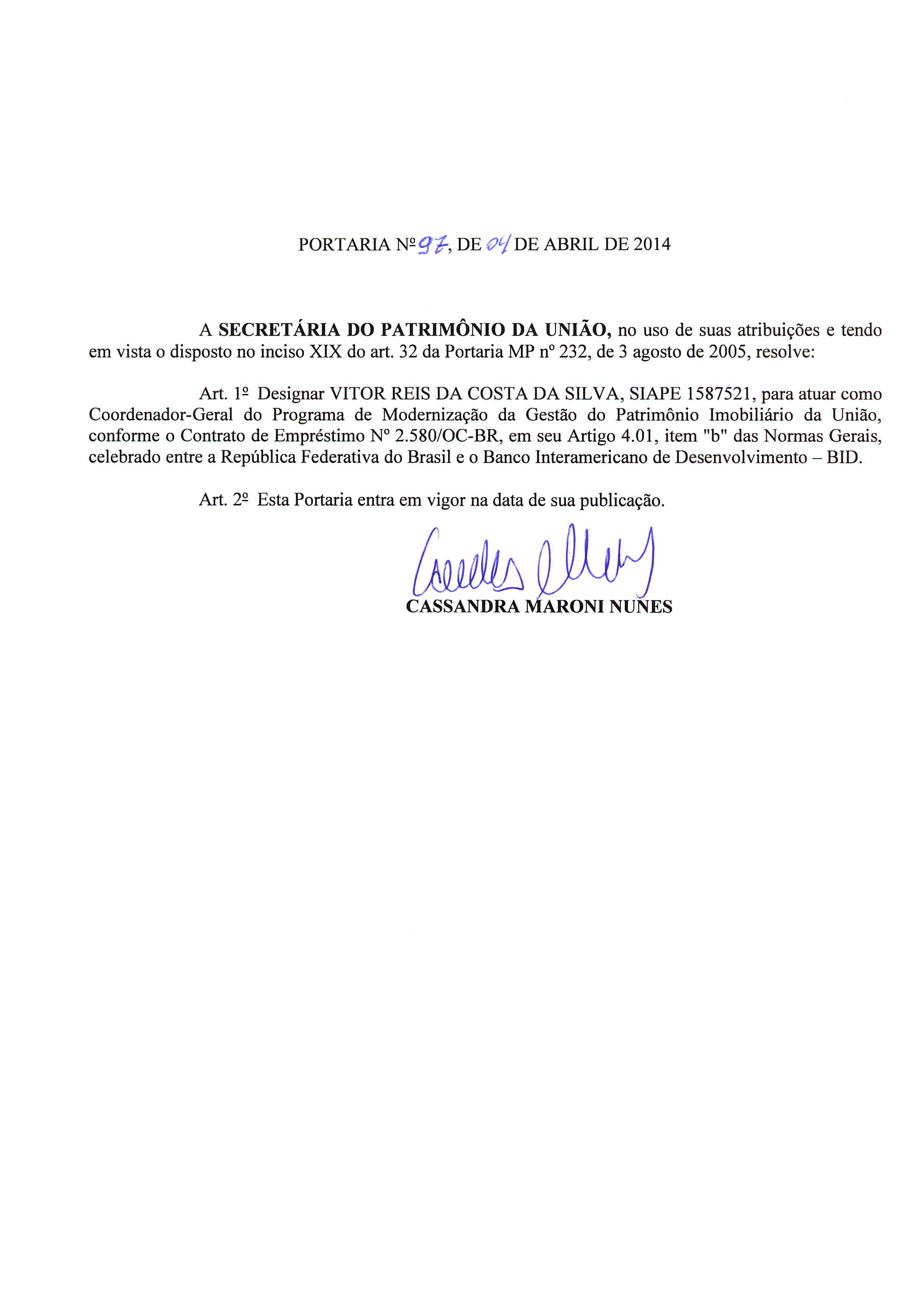 Portaria SPU nº 97 - Ato de Nomeação do 2º Coordenador Geral do Programa