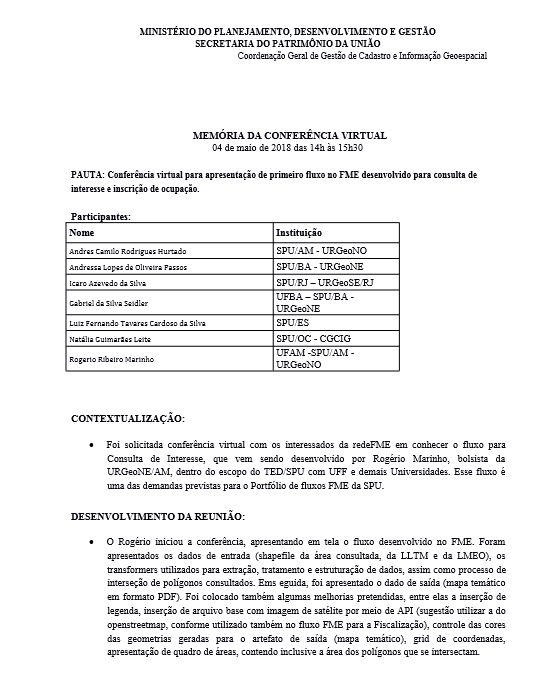 PAUTA:Conferência virtual para apresentação de primeiro fluxo no FME desenvolvido para consulta de interesse e inscrição de ocupação