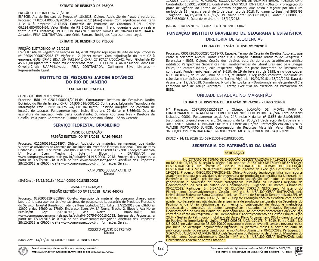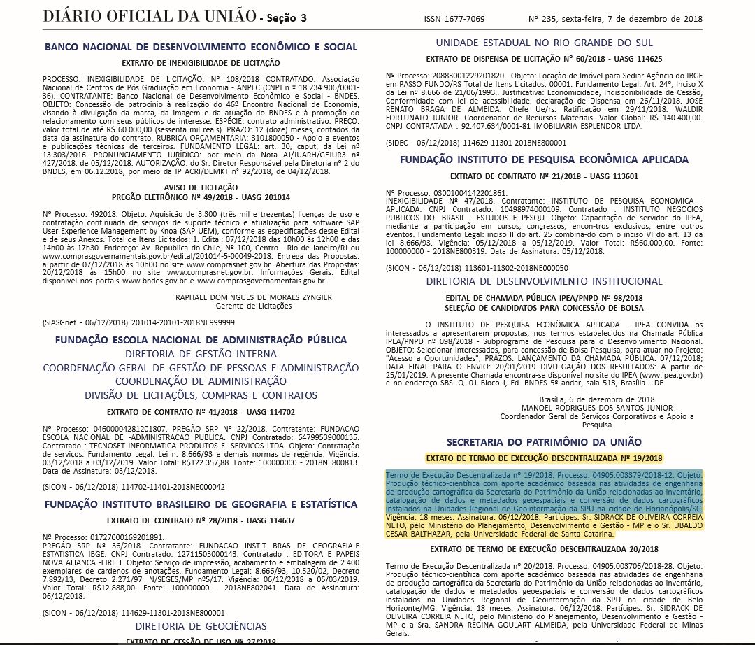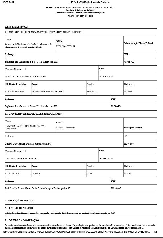 Termo de Execução Descentralizada nº 19/2018. Processo: 04905.003379/2018-12. Objeto: Produção técnico-científica com aporte acadêmico baseada nas atividades de engenharia de produção cartográfica da Secretaria do Patrimônio da União relacionadas ao inventário, catalogação de dados e metadados geoespaciais e conversão de dados cartográficos instalados na Unidades Regional de Geoinformação da SPU na cidade de Florianópolis/SC.