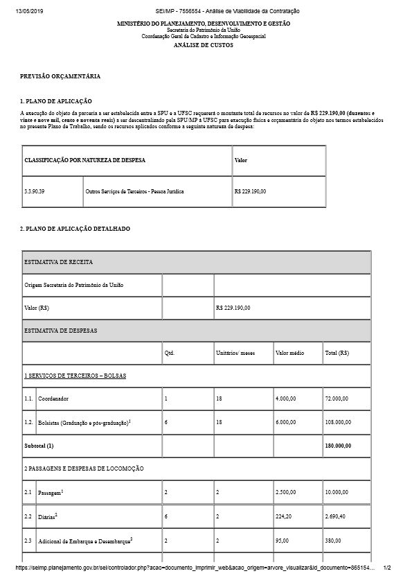 Plano de Trabaho do Termo de Execução Descentralizada com a Universidade Federal de Santa Catarina - UFSC para continuidade dos trabalhos no âmbito da Geoinformação na SPU
