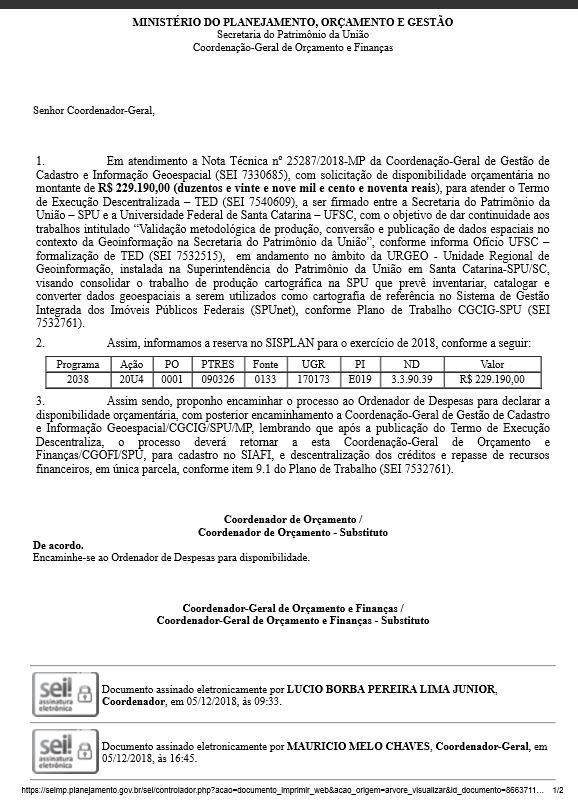 Assinatura de Termo de Execução Descentralizada com a Universidade Federal de Santa Catarina - UFSC para continuidade dos trabalhos no âmbito da Geoinformação na SPU. Referência: Processo 04905.001132/2018-53