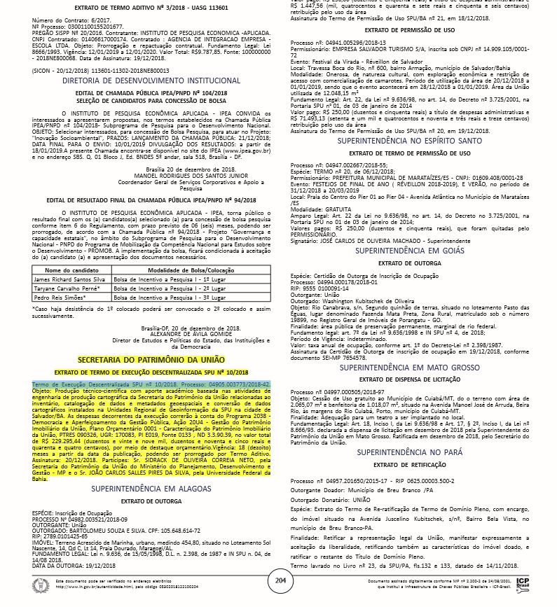 Termo de Execução Descentralizada SPU nº 10/2018. Processo: 04905.003773/2018-42