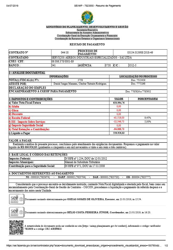 Contrato nº 44/2018 (SERVIÇOS AÉREOS INDUSTRIAIS ESPECIALIZADOS - SAI LTDA