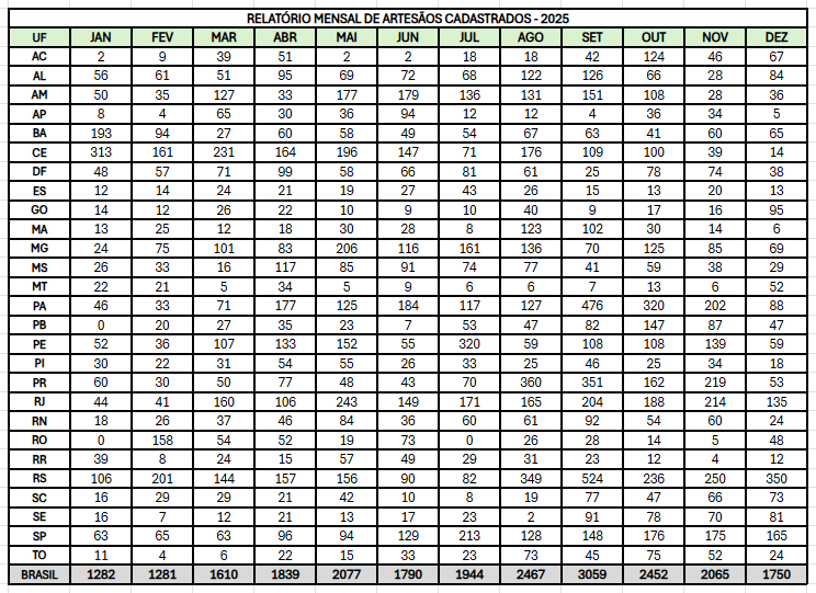 Relatório mensal de artesãos cadastrados em 2025