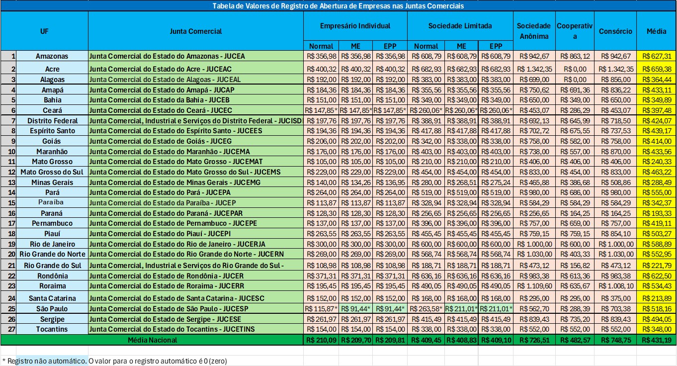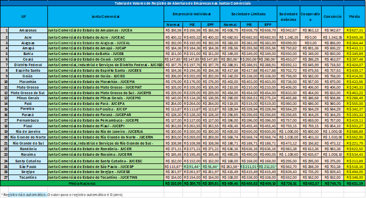 Tabela de valores