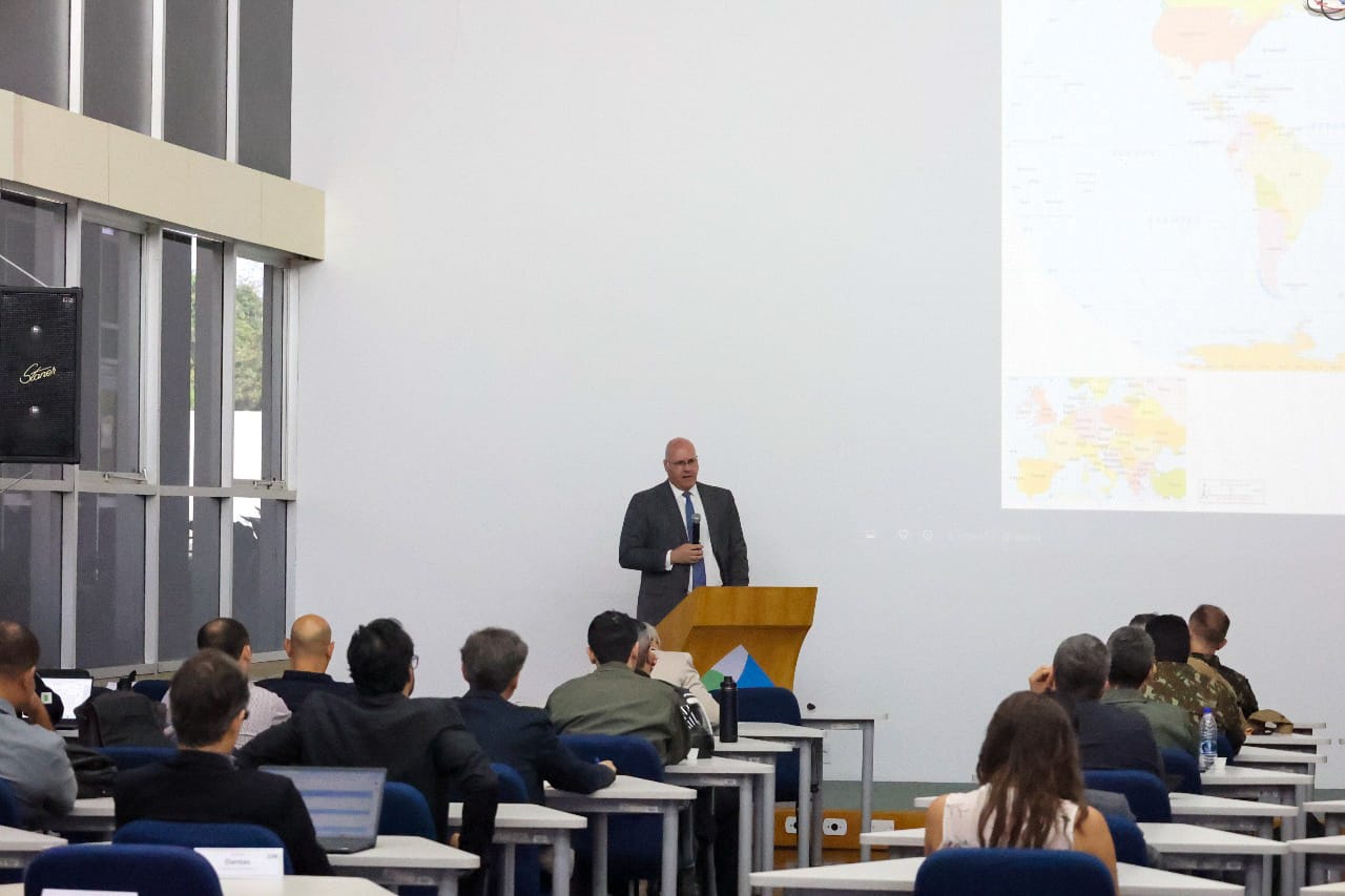 O Ministro Herbert Drummond, do Departamento de Assuntos Estratégicos, de Defesa e de Desarmamento do Ministério das Relações Exteriores (DDef/MRE), abordou a agenda de Defesa no âmbito da Política Externa, destacando o papel da diplomacia na inserção internacional do Brasil e na articulação de estratégias que reforcem os interesses nacionais no cenário global.
