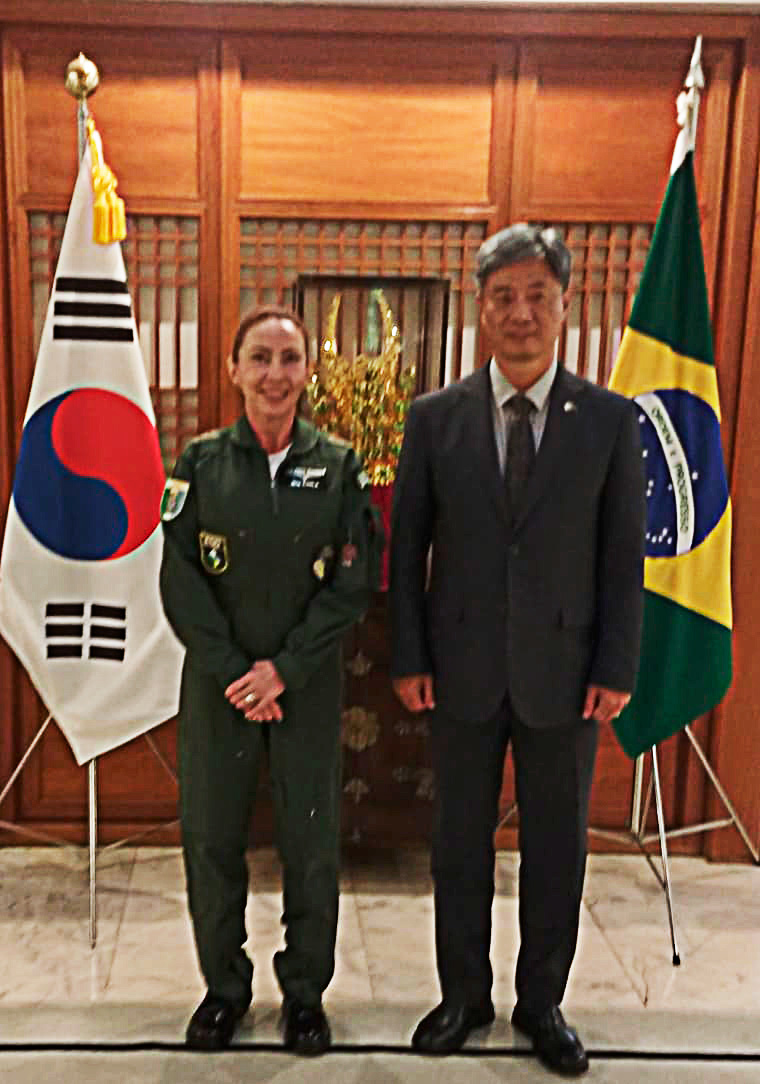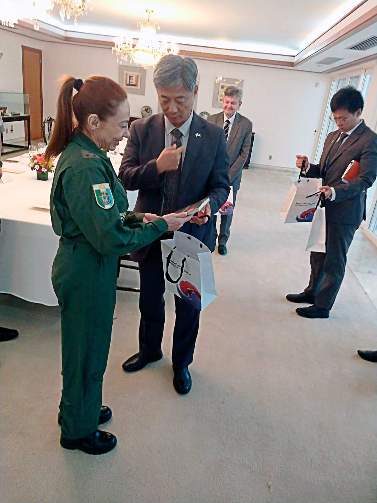 Diante do interesse manifestado pelo embaixador Choi, a Major-Brigadeiro Carla discorreu sobre os cursos realizados na ESD e esclareceu ainda não ter havido oportunidade para a participação de alunos da Coreia do Sul.