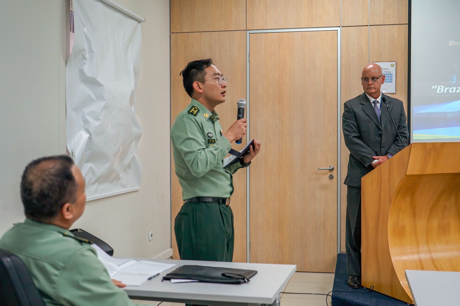 Na oportunidade, o Coordenador-Geral Acadêmico da ESD, General de Brigada Marcelo Gurgel do Amaral Silva, recebeu a comitiva e comentou sobre os 50 anos de relações diplomáticas Brasil-China, que foram comemorados durante um evento na Escola no mês de setembro, reforçando a importância da parceria entre os dois países.