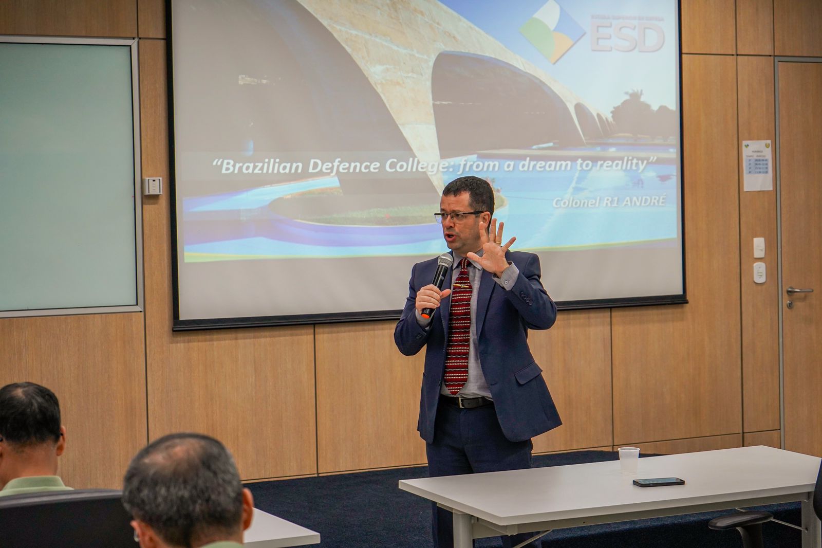 Logo após, o Diretor-Adjunto do Curso de Altos Estudos em Defesa (CAED), Coronel André de Souza Monteiro, falou sobre a missão, os valores, as principais atividades e os cursos da ESD. “A Escola Superior de Defesa, localizada em Brasília, desenvolve estudos, pesquisas, atividades de extensão, ensino e intercâmbio em temas de interesse da sociedade relacionados à defesa, priorizando servidores civis dos três poderes da União e de instituições privadas, em atendimento ao disposto na Estratégia Nacional de Defesa", explicou.