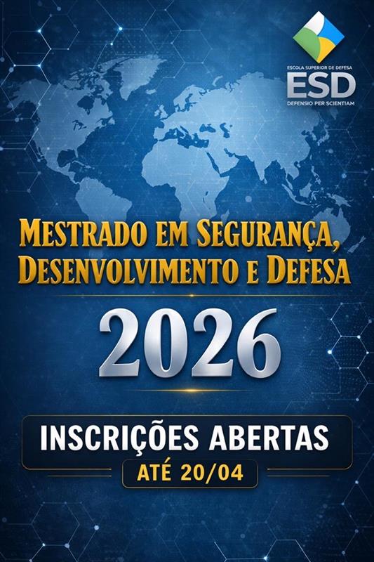 A Escola Superior de Defesa (ESD) iniciou, nesta segunda-feira (09/03), o Processo Seletivo para Admissão de Aluno Regular no Programa de Pós-graduação em Segurança, Desenvolvimento e Defesa (PPGSDD) 2026, nível Mestrado. As inscrições seguem abertas até o dia 20 de abril.