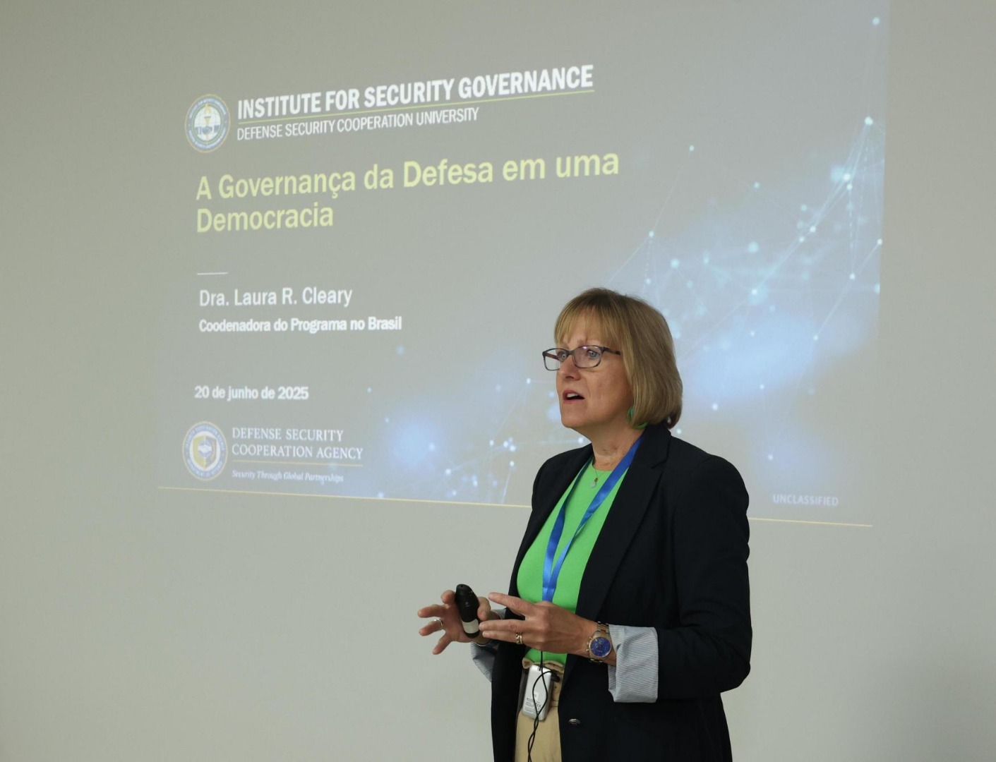 Já a Profª. Drª Laura abordou o tema “A Governança da Defesa em uma Democracia”. Ao longo da sua exposição, discorreu sobre a importância da boa governança nos setores de segurança e de defesa. Ela trouxe, ainda, reflexões sobre o conceito brasileiro de defesa e sua articulação com políticas públicas nacionais, enfatizando a necessidade de integração entre civis e militares, assim como a importância da nova Carreira de Desenvolvimento das Políticas de Justiça e Defesa a ser implementada pelo governo brasileiro.