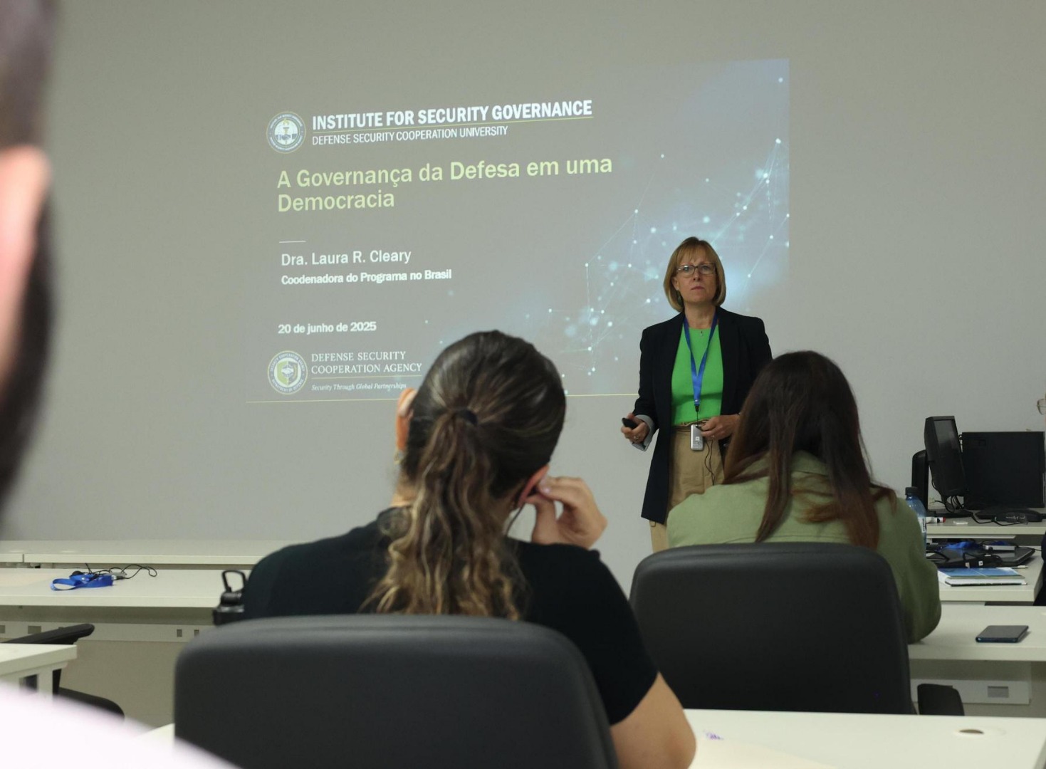 O painel contou com apresentações da Chefe da Divisão Pedagógica e coordenadora do evento, CMG Patricia Pontes; da líder do projeto do Institute for Security Governance (ISG), Prof.ª Dr.ª. Laura R. Cleary; e do Prof. Dr. Peterson Silva, docente da Escola Superior de Defesa (ESD).