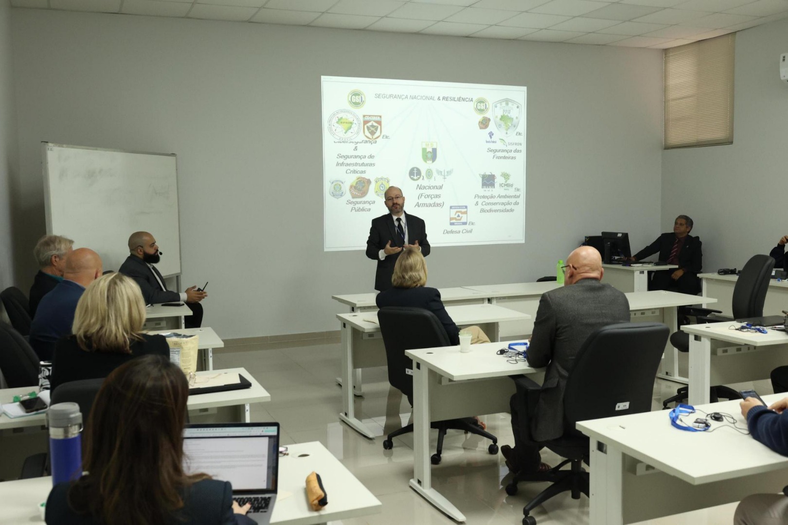 Complementando a discussão, o Prof. Dr. Peterson compartilhou técnicas e abordagens de metodologias ativas de aprendizagem utilizadas em sala de aula no ensino dos conceitos de segurança, desenvolvimento e defesa. Por fim, destacou a importância de fazer com que civis e militares compreendam que diversos órgãos e entidades têm seu papel no fortalecimento da segurança da sociedade e do Estado.