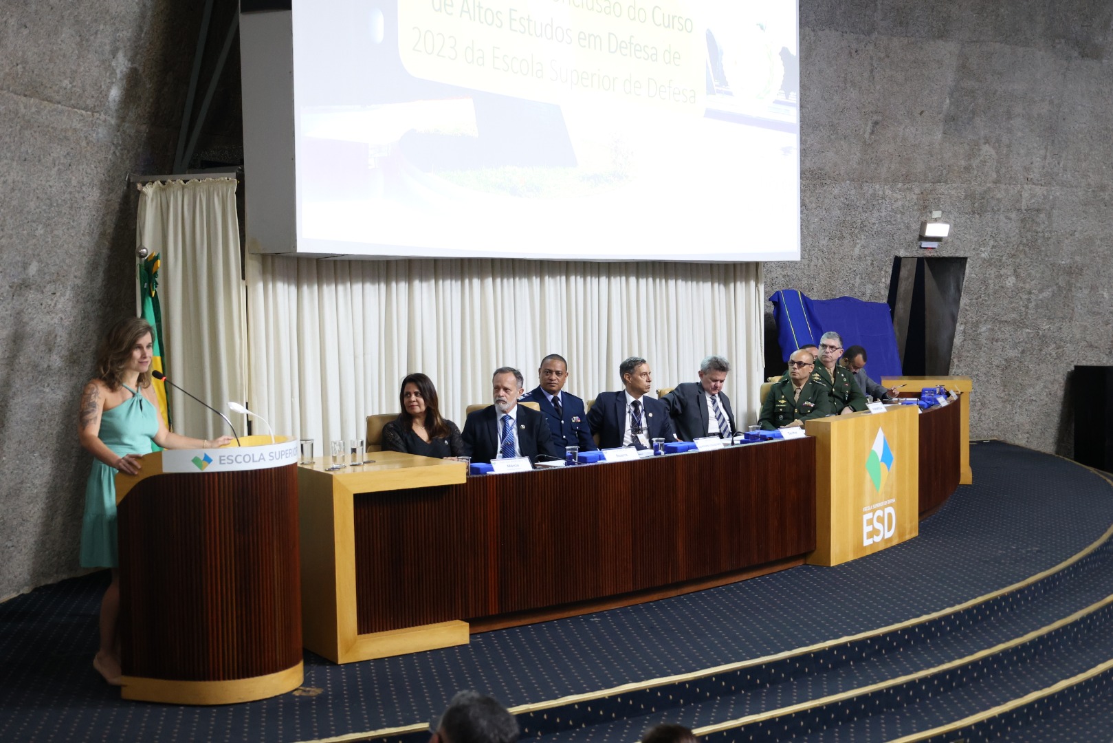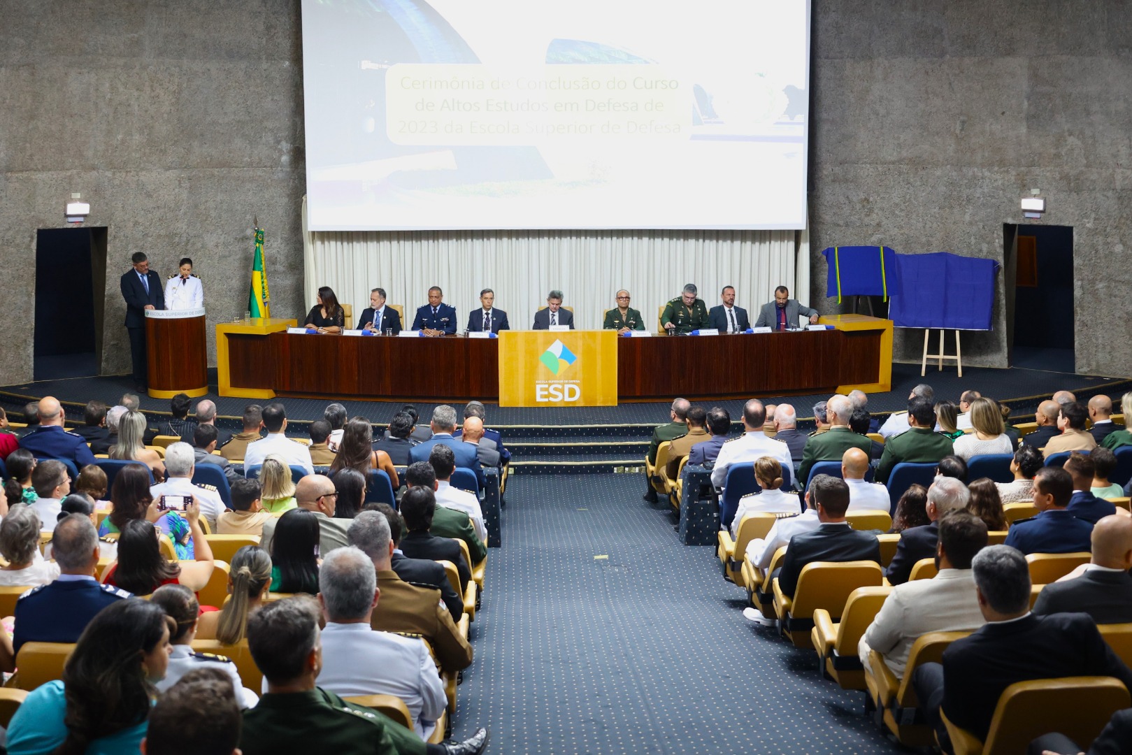 A cerimônia de encerramento e diplomação da 6ª Edição do Curso de Altos Estudos em Defesa (CAED-2023) ocorreu nessa quinta-feira (30/11), na Escola Superior de Defesa (ESD), em Brasília (DF). O objetivo do Curso é preparar civis e militares das Forças Armadas, dos Estados e do Distrito Federal para desenvolver competências em matéria de segurança, desenvolvimento e defesa, a partir de estudos sobre a realidade brasileira e seu entorno, priorizando os interesses da função estatal Defesa Nacional.