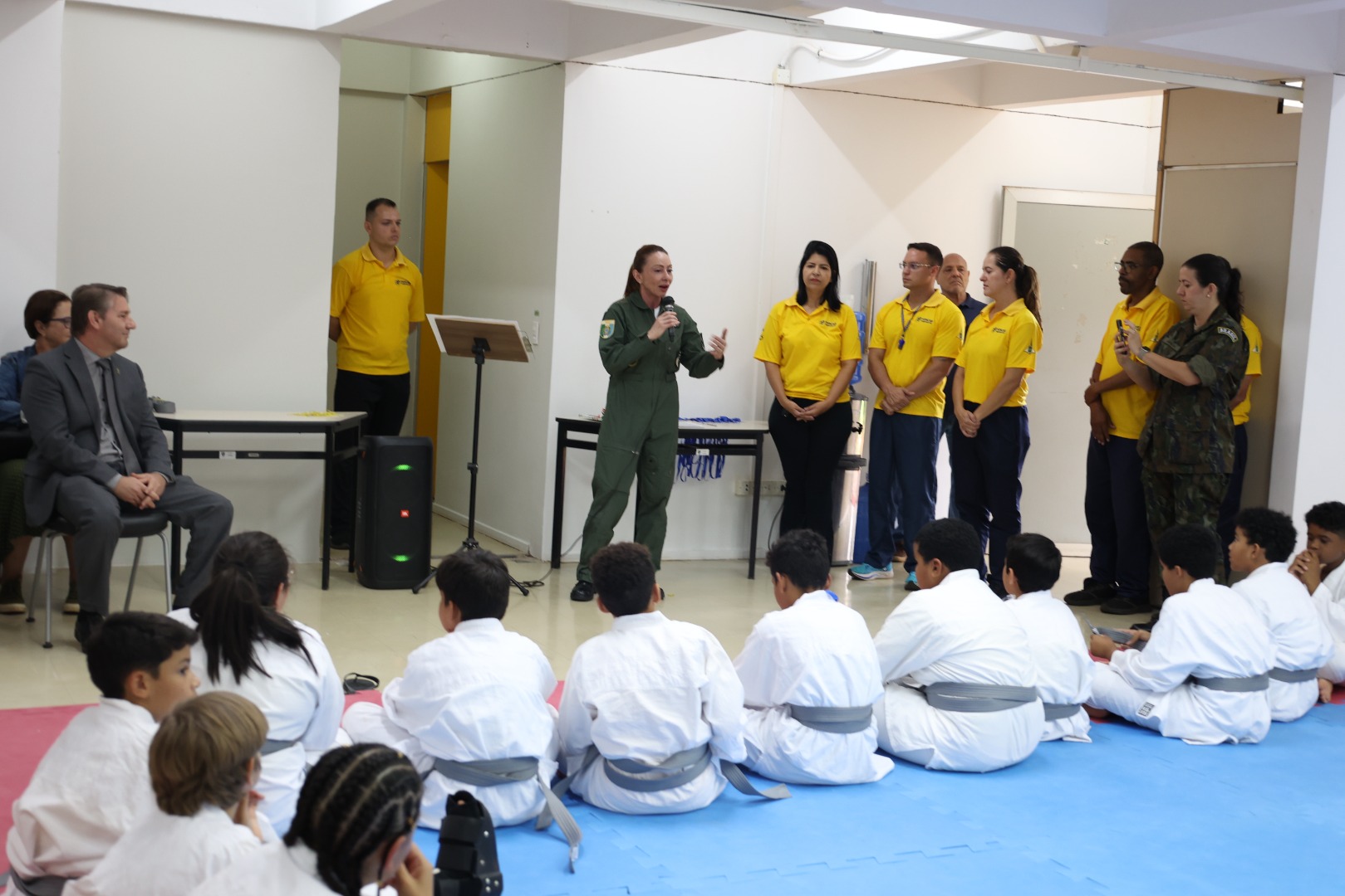 A Major-Brigadeiro Carla parabenizou o esforço das crianças e dos professores e, ainda, reforçou o compromisso da Escola com a formação integral de crianças e adolescentes por meio do esporte e da educação. “Conseguimos ver nos olhares dessas crianças os resultados práticos. Parabéns. Vocês são o sentido de estarmos aqui hoje. Isso é uma conquista e espero que tenhamos muitas outras. Estaremos aqui para fornecer para vocês todos os recursos e todo o apoio que vocês precisarem”, pontuou.