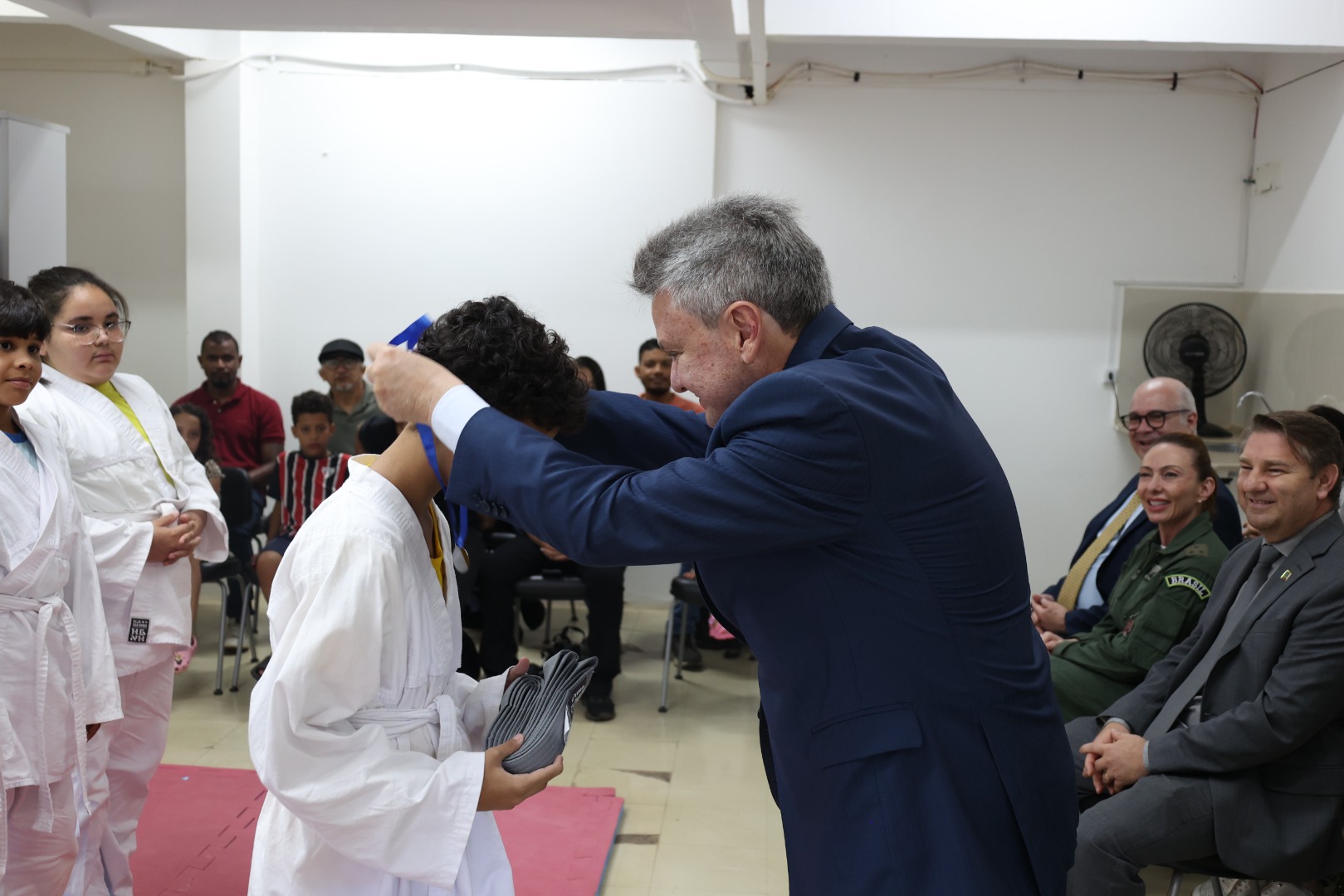 A cerimônia contou com uma demonstração de judô, na qual os participantes apresentaram as técnicas aprendidas ao longo do ciclo de treinamento. Na sequência, ocorreu a entrega das faixas, medalhas e certificados, simbolizando a evolução dos alunos e o reconhecimento pelo esforço e compromisso demonstrados.