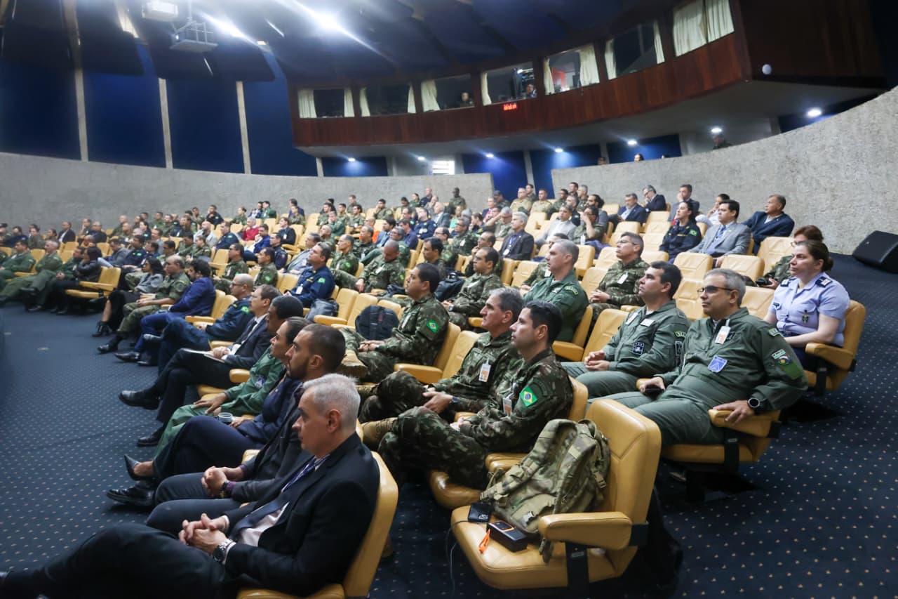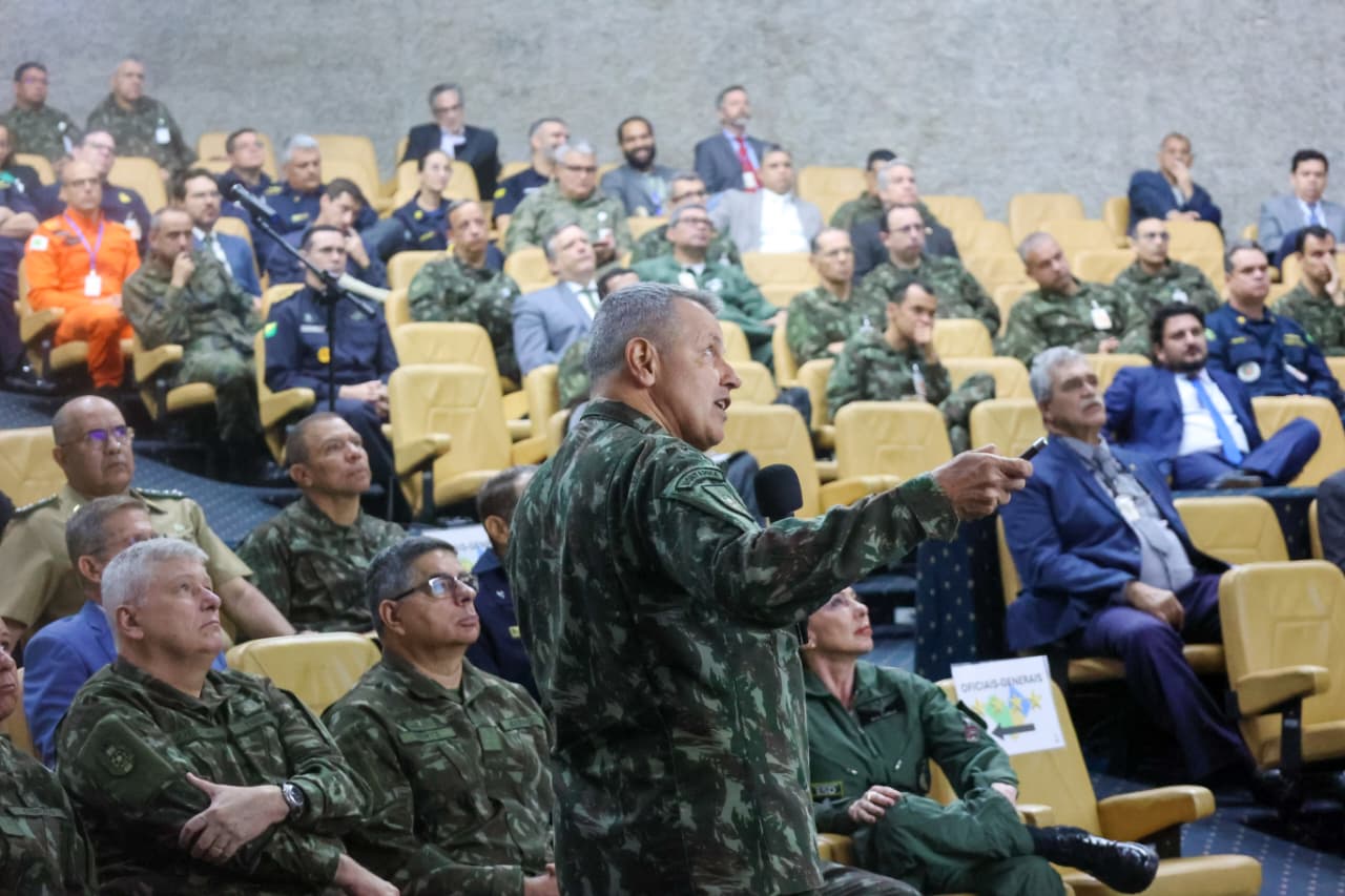 Durante a exposição, o General de Exército apresentou uma análise estratégica sobre o cenário atual e futuro da Força Terrestre, abordando temas como inteligência artificial, modernização, preparo e o papel do Exército no cumprimento de suas missões.