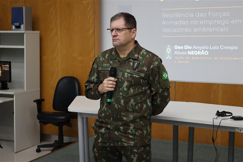 Por fim, o Seminário contou com uma apresentação do General de Divisão Anysio Luiz Crespo Alves Negrão (DGP/APG), intitulada “Operação Taquari II no atendimento às enchentes no Rio Grande do Sul: aprendizados para o desenvolvimento de uma resiliência nacional”.