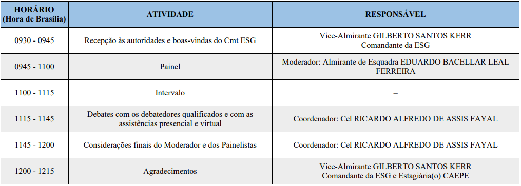 No dia de 23 de agosto de 2023, das 09h 30 min às 12h 15 min, o Centro de Estudos Estratégicos Marechal Cordeiro de Farias conduzirá, no âmbito da Escola Superior de Guerra (ESG), um seminário dedicado à temática da “ Zona de Paz e Cooperação do Atlântico Sul (ZOPACAS)”. A atividade será desenvolvida no formato híbrido, ou seja, com audiências remota e presencial, de maneira sincrônica.