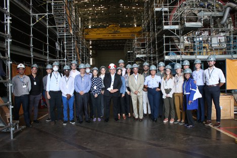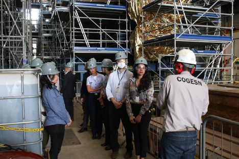 Em seguida, o grupo realizou visita guiada nas instalações da UFEM e do ESC, na qual conheceram mais sobre as construções do Complexo Naval de Itaguaí que conta, atualmente, com um complexo de infraestrutura industrial e um de apoio à operação dos submarinos, englobando os estaleiros, a Base Naval e a UFEM.