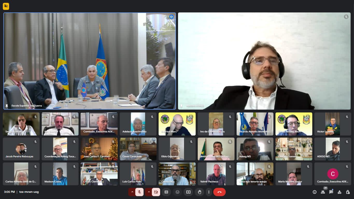 Durante o encontro, realizado por videoconferência, o VA Cardoso, presidente de honra da ADESG, saudou os 29 delegados e representantes e agradeceu pelo trabalho e esforço de cada um na condução das atividades da Associação, parabenizando pelos avanços conquistados em 2024 e incentivando a ampliação da ADESG como importante instrumento estratégico para difundir a mentalidade de defesa para a sociedade em todo o território nacional.