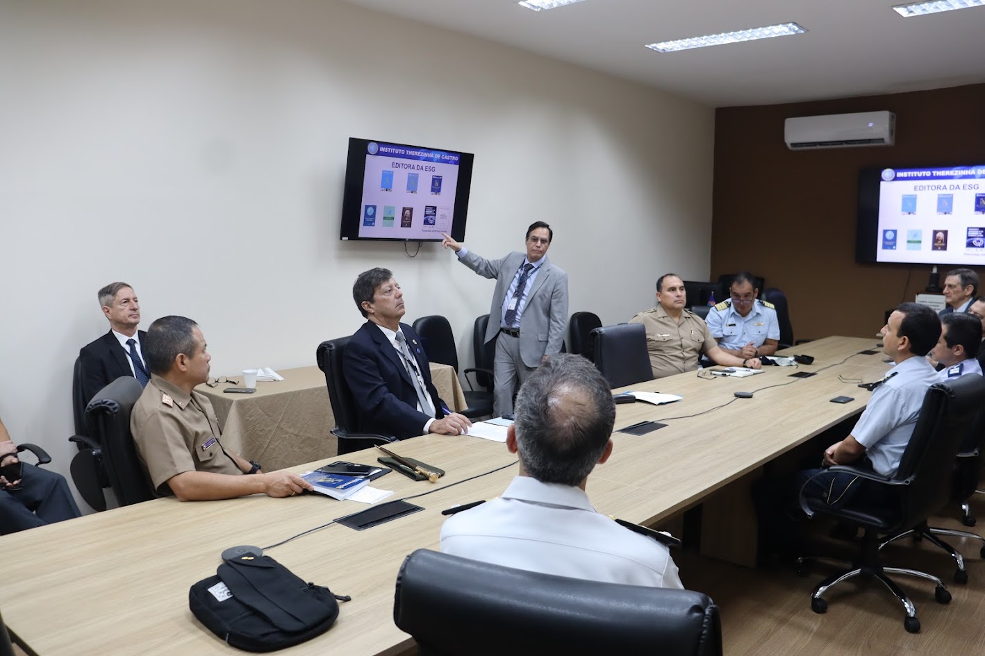 Representantes do Centro de Estudos Estratégicos Cordeiro de Farias, do Instituto Therezinha de Castro, da Assessoria de Seleção, Planejamento e Avaliação de Ensino e do Instituto de Doutrina de Operações Conjuntas realizaram apresentações sobre seus respectivos setores e esclareceram as dúvidas dos oficiais peruanos.