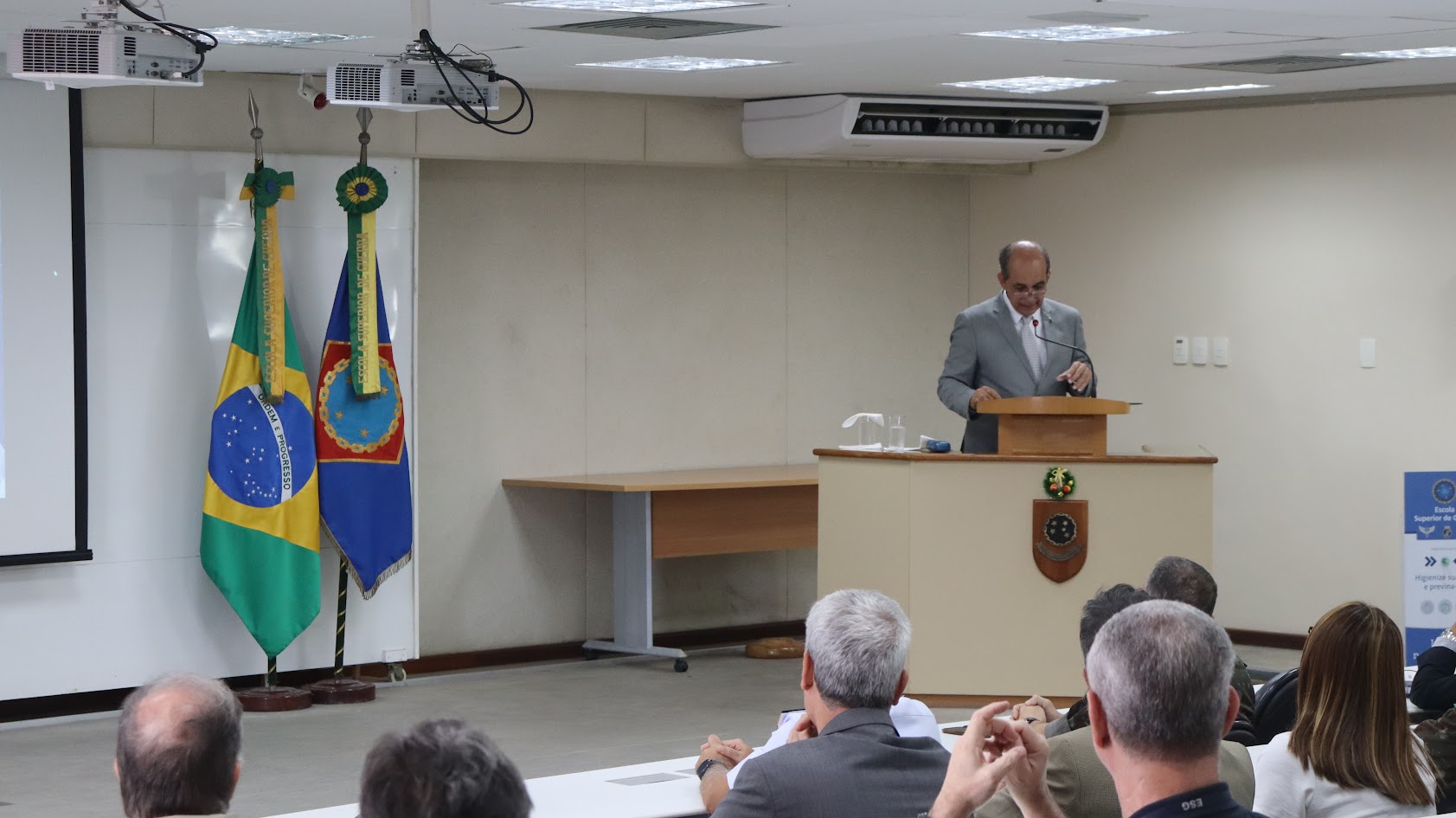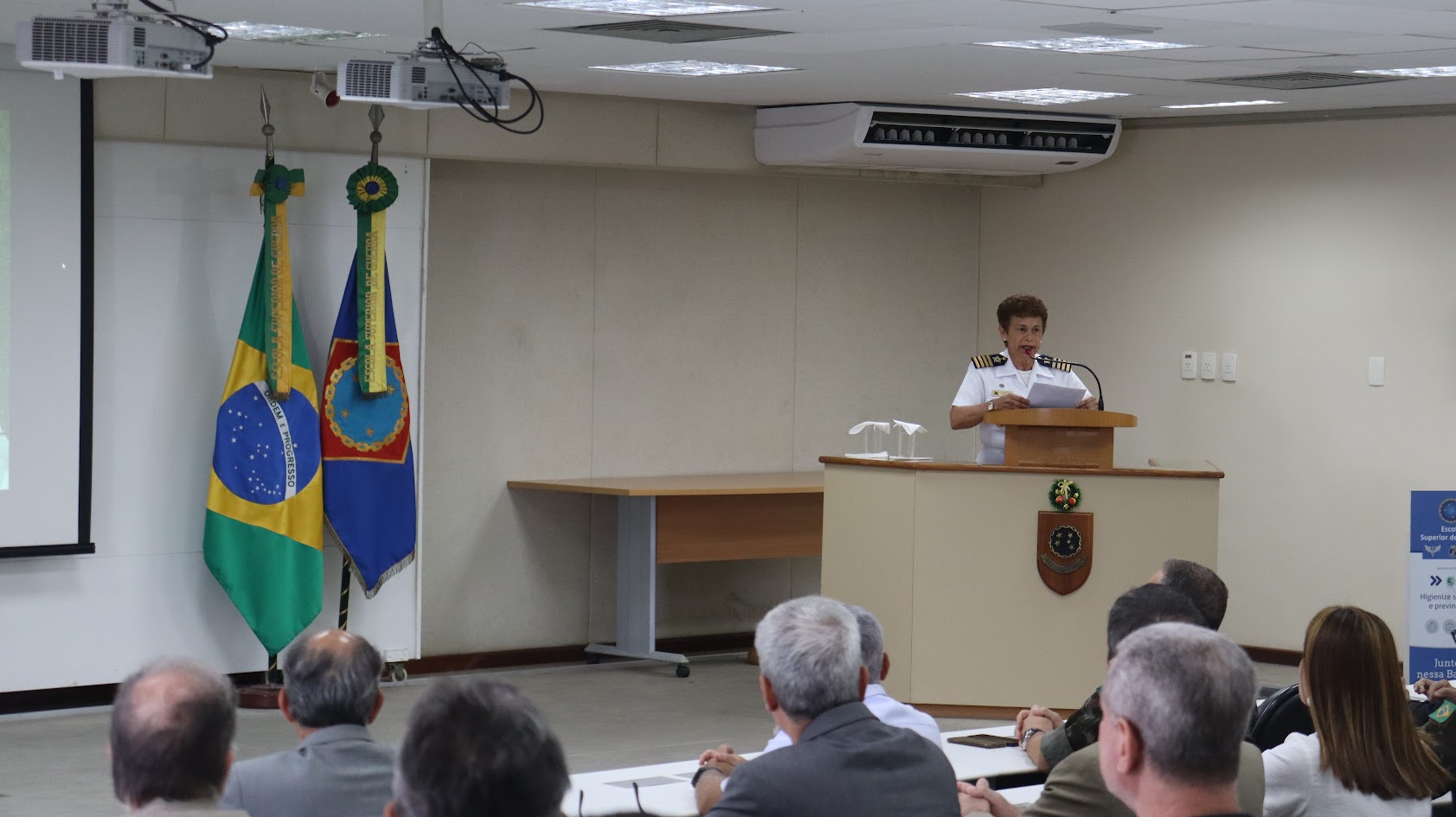 Em seguida, o assistente militar da MB na ESG, Contra-Almirante Gilberto Cezar Lourenço, fez a leitura da Mensagem do Ministro de Estado da Defesa, José Mucio Monteiro Filho, alusiva ao Dia do Marinheiro. “No dia de hoje, a bordo do Capitânia da Esquadra, tenho o orgulho e a satisfação de saudar homens e mulheres, que ao integrar a Marinha do Brasil, com seus trabalhos, se empenham para construir uma Força Naval cada vez mais forte, sempre solidária às demandas do nosso povo e comprometida com a soberania de nossa Nação. A profissão militar tem suas peculiaridades e, pelo que percebo, nela é muito presente o trabalho silencioso e muitas vezes anônimo. No caso da Marinha vejo uma particularidade ainda mais adversa, na medida em que, para cumprir suas principais tarefas, seu pessoal e seus navios são obrigados a ‘fazerem-se ao mar’, permanecendo distantes dos ‘olhos’ da sociedade. São marinheiros ‘de corpo’ e ‘de alma’ que se submetem aos rigores do mar, ao afastamento familiar e aos regimes diuturnos de serviço, defendendo os interesses do País e honrando compromissos internacionais”, disse em trecho da mensagem.