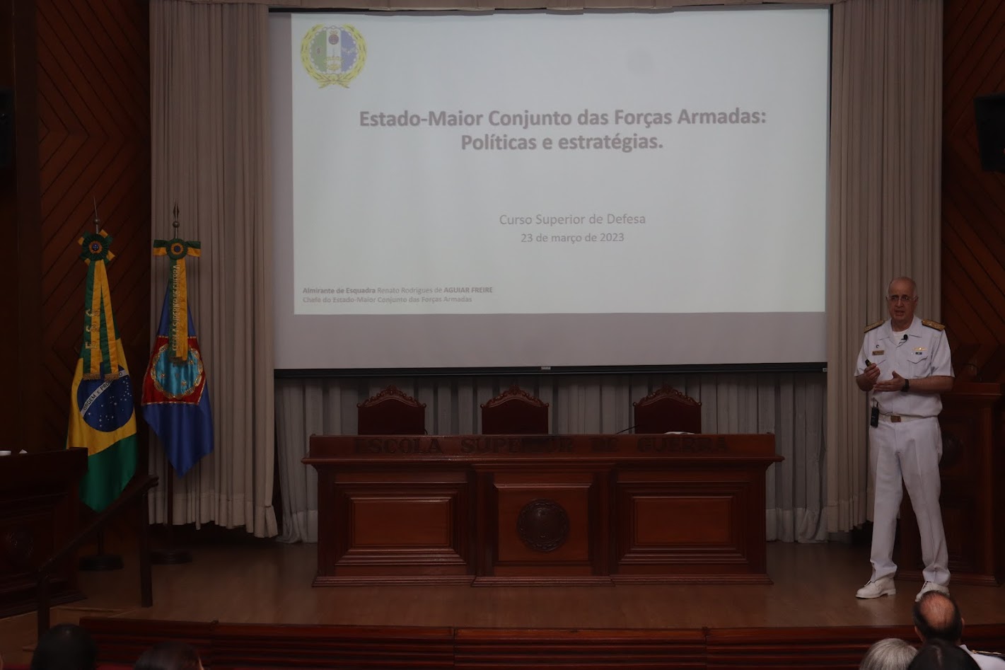 A Escola Superior de Guerra (ESG) iniciou, no dia 20 de março, as atividades curriculares do Curso Superior de Defesa (CSD) 2023, com a participação de 169 estagiários oriundos dos cursos de altos estudos realizados pelas Forças Armadas e pela ESG. Ao longo da semana de 20 a 24 de março, oficiais das três Forças Armadas proferiram palestras sobre temas relacionados à Defesa, Política e Estratégia e Relações Internacionais.