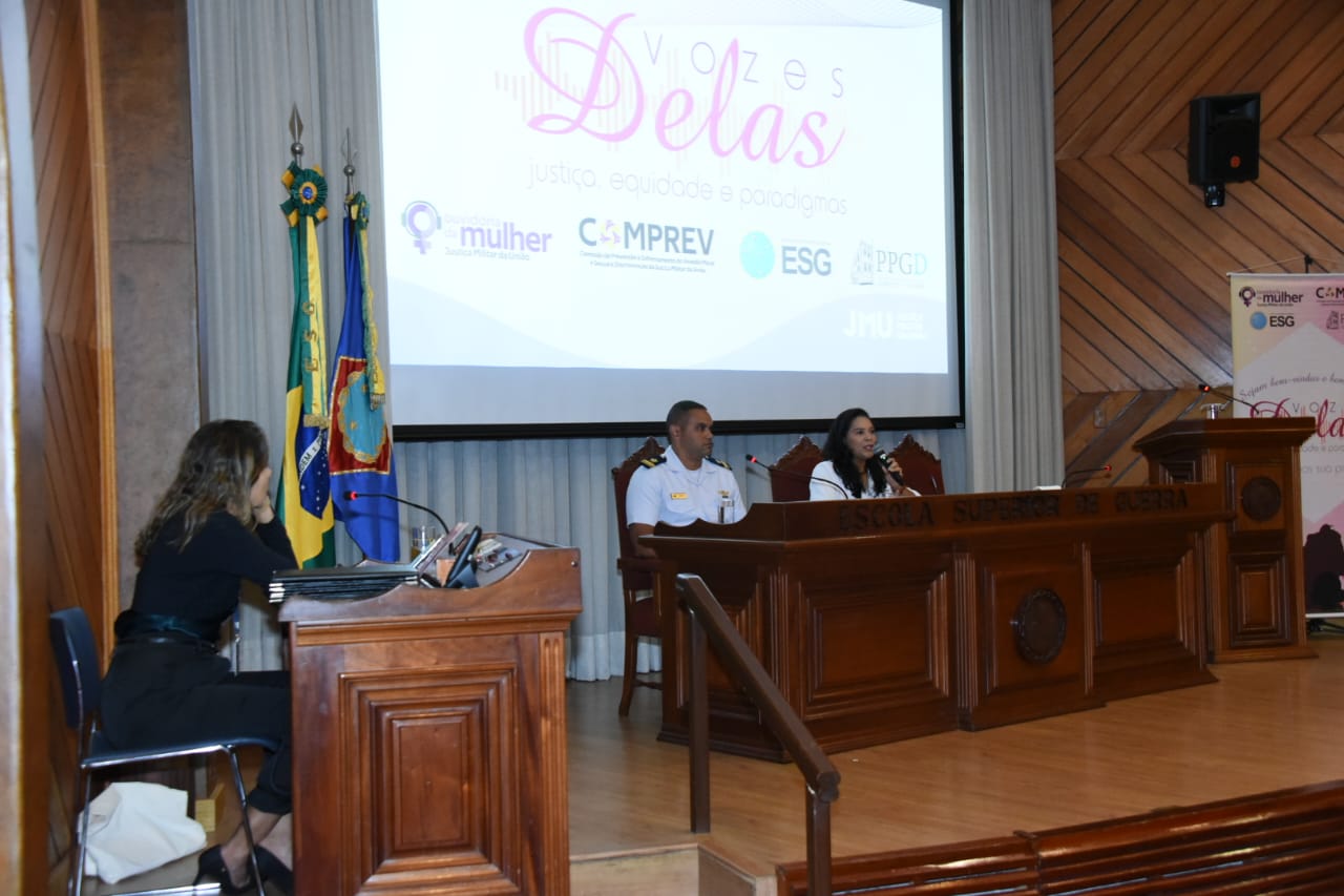 Com o objetivo de promover o debate e a reflexão acerca de temas relacionados à garantia e proteção dos direitos das mulheres e fomentar o intercâmbio entre os mais variados setores da sociedade, o I Simpósio “Vozes Delas – Justiça, Equidade e Paradigmas” reuniu civis e militares na Escola Superior de Guerra (ESG), na Urca, ontem (6) e hoje (7), além de ser transmitido em tempo real pela plataforma Zoom. O evento é uma iniciativa da Ouvidoria da Mulher da Justiça Militar da União (JMU) e conta com o apoio do Superior Tribunal Militar (STM) e da Comissão de Prevenção e Enfrentamento do Assédio Moral, do Assédio Sexual e da Discriminação da JMU, em parceria com a ESG e com a Universidade Federal do Estado do Rio de Janeiro.