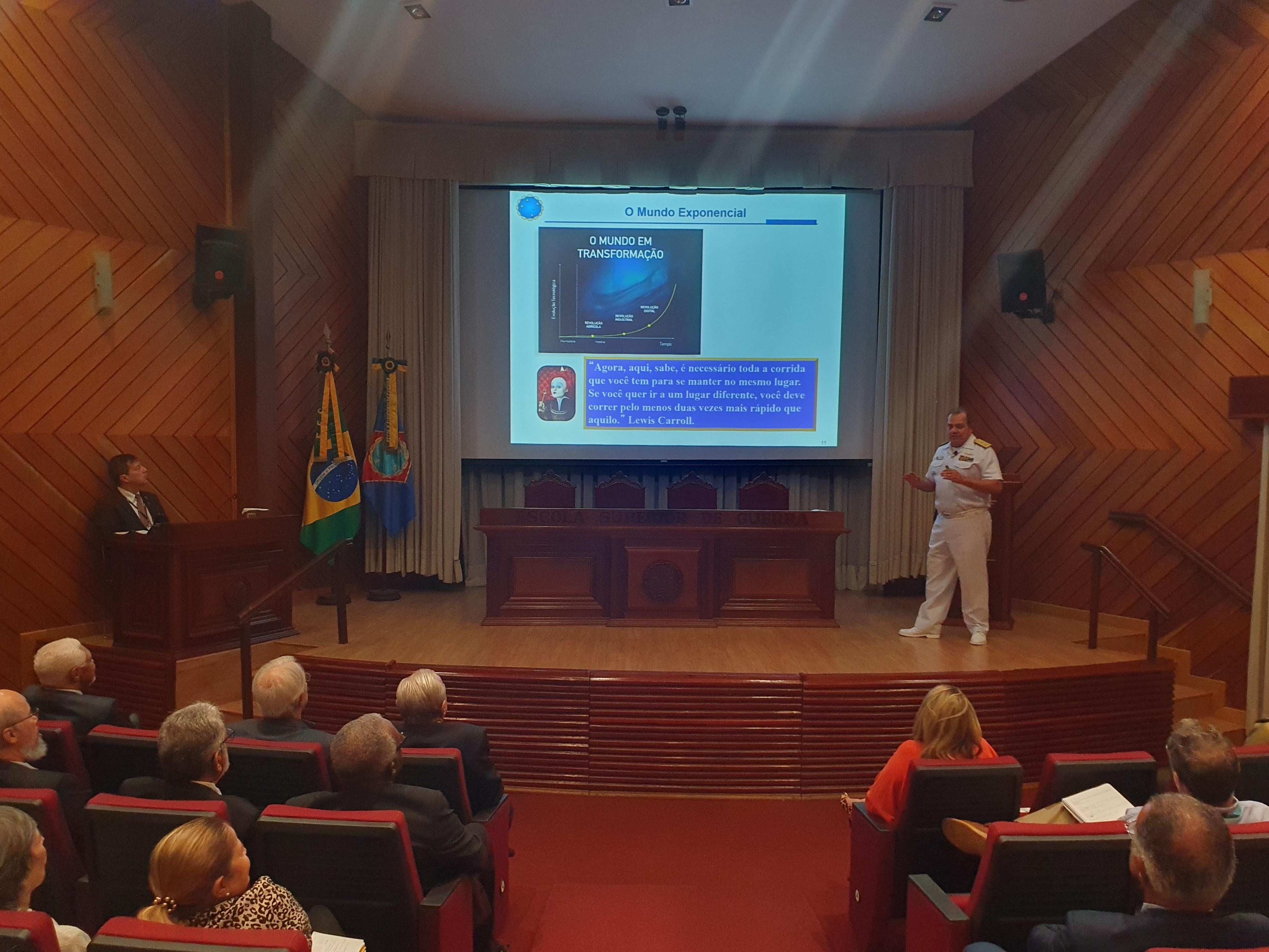 O Comandante da Escola Superior de Guerra (ESG), Vice-Almirante Gilberto Santos Kerr, proferiu uma palestra para cerca de 50 integrantes da Associação dos Diplomados da ESG (ADESG) na tarde desta terça, 18 de abril, no auditório Professor Oliveira Junior da ESG. A palestra com o tema “A Armadilha de Tucídides e o Mundo Líquido, Exponencial e Desregulamentado” inaugurou o programa “Análise da conjuntura segundo a visão do sistema ESG/ADESG”, que a Associação idealizou e que contará com outras palestras ao longo do ano.