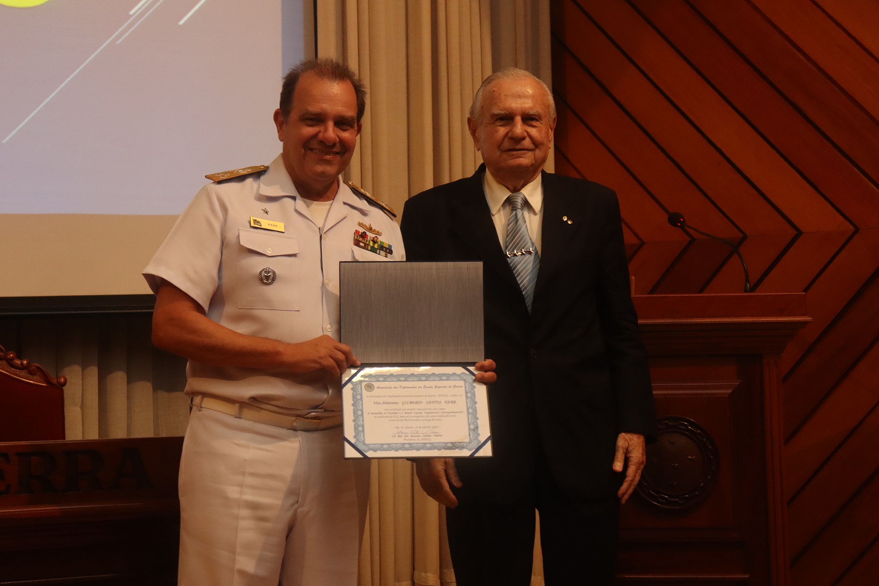 Após a palestra, os integrantes da ADESG formularam questões, respondidas pelo Almirante Kerr. Em seguida, o General de Exército Licínio Nunes de Miranda Filho, ex-membro do alto escalão do Exército Brasileiro, ex-presidente da ADESG e membro do Conselho Superior da Associação, proferiu palavras de agradecimento ao Comandante da ESG. “A rica, atual e sofisticada apresentação do senhor nos trouxe muito conhecimento, razão pela qual, em nome de nossa Associação, braço longo e sempre a dispor da ESG, cumprimento-o em nome de todos os integrantes da ADESG.”