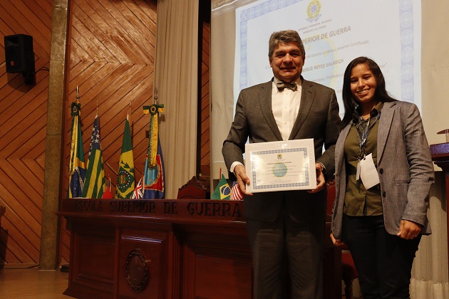 Aluna do Mestrado, Yasmim Reis, ao lado do Professor Luis Biitencourt, do William J. Perry Center, no Seminário “Reflexões sobre os Estudos de Defesa”
