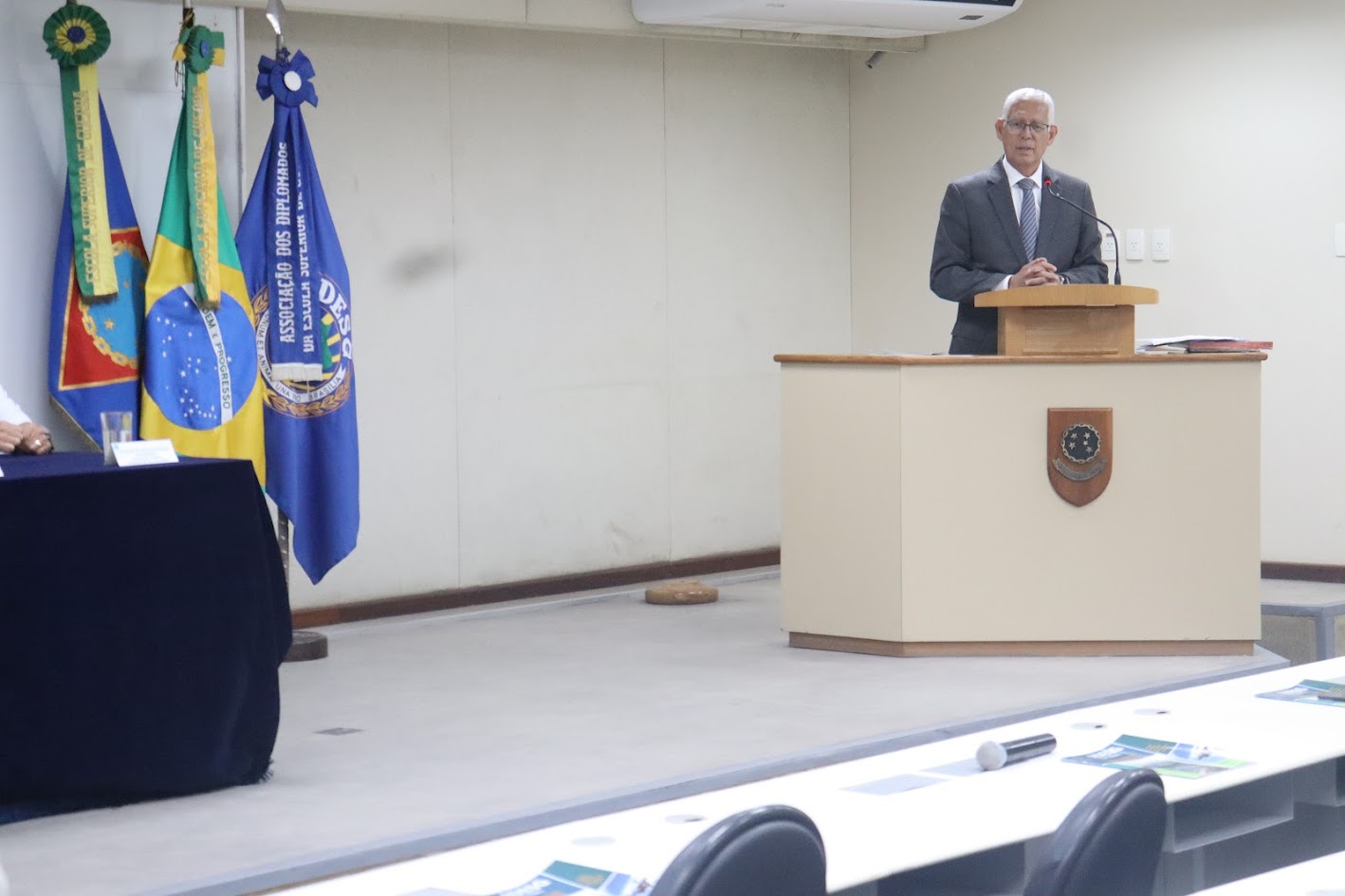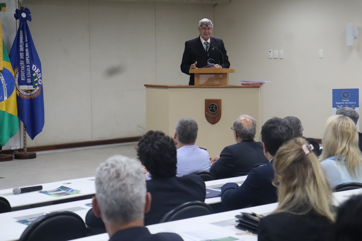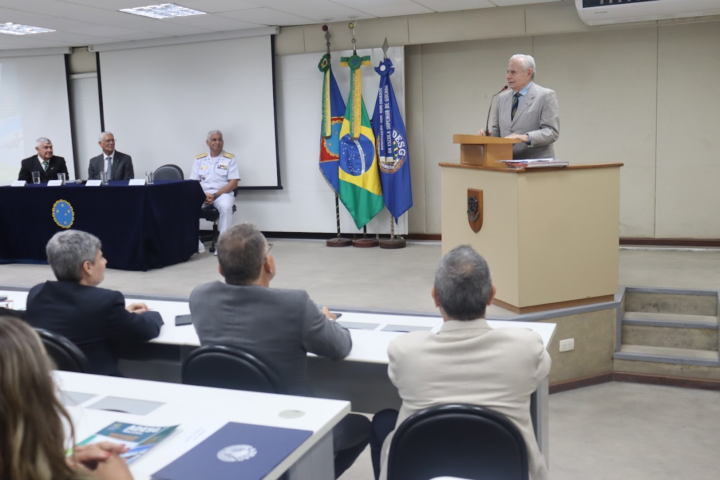 A solenidade, realizada no auditório da ESG, foi prestigiada pelo decano da ADESG, General Licínio Nunes de Miranda; pelo antigo comandante da ESG e ex-presidente de honra da ADESG Almirante de Esquadra Alípio Jorge Rodrigues da Silva; pelo comandante da ESG e presidente de honra da ADESG, Vice-Almirante Marcelo Menezes Cardoso; pelo presidente da ADESG Nacional, Coronel da Força Aérea Brasileira Antônio Celente Videira, que compuseram a mesa de honra, dentre outras autoridades civis, militares e representantes de instituições apoiadoras da ADESG.