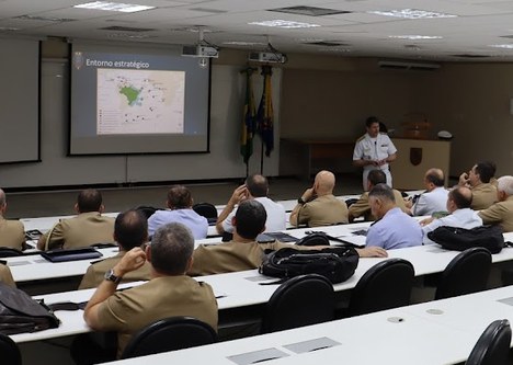 Na quinta-feira (17), os estagiários do CEPOG assistiram as palestras dos convidados General de Divisão José Ricardo Vendramim Nunes, Chefe do Centro de Comunicação Social do Exército, que versou sobre a ONU e Operações de Paz; Major Brigadeiro do Ar Alcides Teixeira Barbacovi, Chefe do Estado-Maior Conjunto do Comando de Operações Aeroespaciais, que abordou o Emprego do Poder Aeroespacial; e Vice-Almirante (FN) Carlos Chagas Vianna Braga, Comandante do Comando da Força de Fuzileiros da Esquadra, que tratou sobre Operações Interagências.