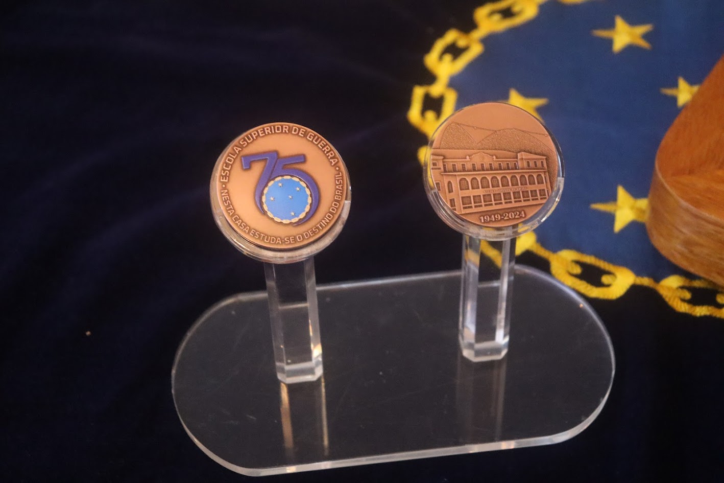 Lançamento de medalha comemorativa - Ainda no dia 19, foi realizada a cerimônia de lançamento da medalha comemorativa dos 75 anos da ESG, confeccionada pela Casa da Moeda do Brasil (CMB). A solenidade de descaracterização do par de cunhos originais da medalha, coordenada pela Assessoria de Relações Institucionais, contou com a participação do comandante da ESG, Vice-Almirante Marcelo Menezes Cardoso, e do presidente da CMB, Sérgio Perini Rodrigues. A medalha, que apresenta em seu anverso a logo dos 75 anos da ESG e, em seu reverso, a fachada do prédio da Escola, com a silhueta de um dos principais cartões-postais do Rio de Janeiro, o Pão de Açúcar, ao fundo, passará a compor o acervo histórico da Sala de Memória.