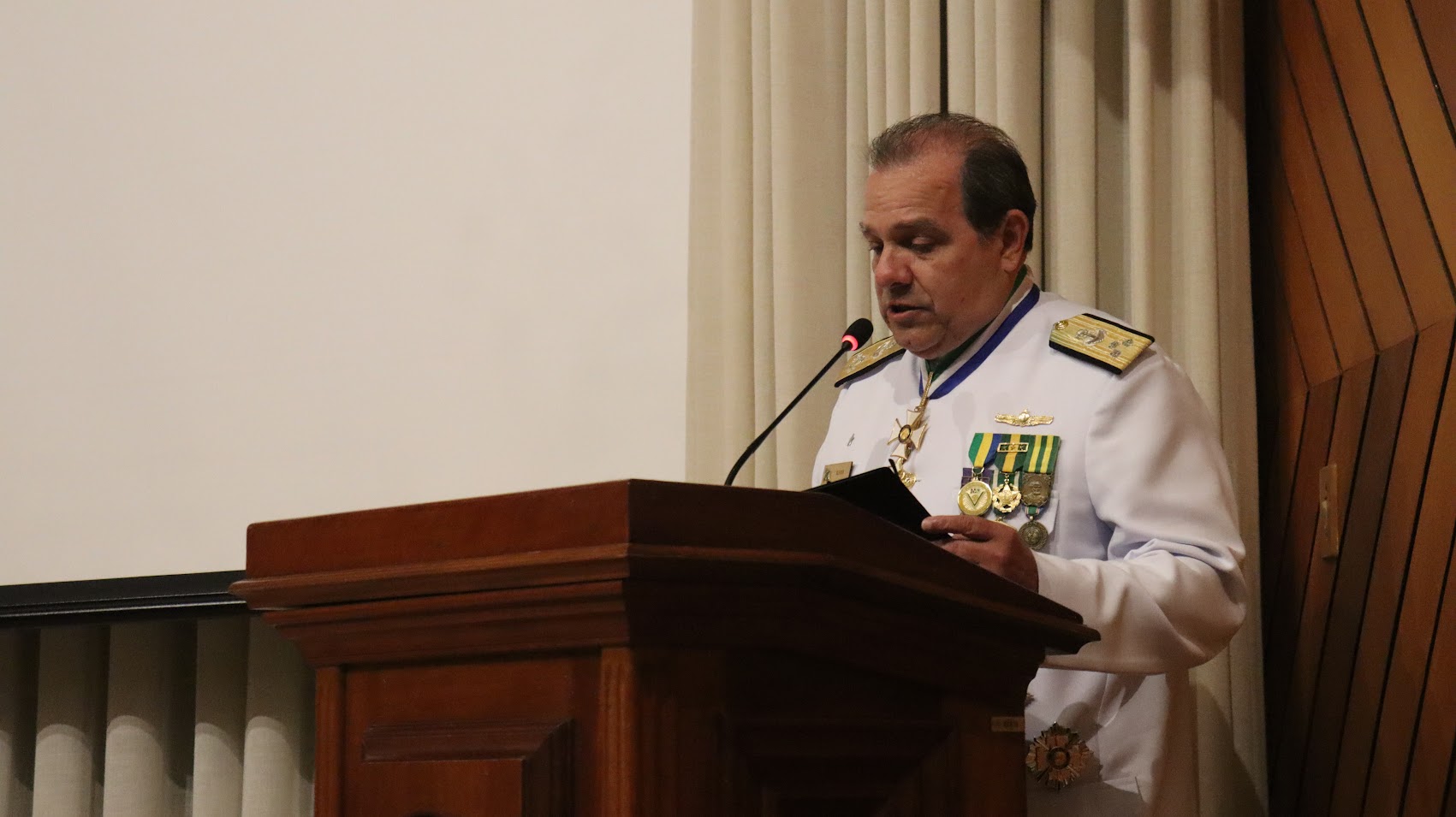 O General de Exército Carlos Machado realizou a leitura da referência elogiosa ao Vice-Almirante Kerr. “Ao embarcar, no dia 6 de dezembro de 2022, nessa tradicional Casa, o Almirante Kerr logo empreendeu um ritmo dinâmico e pragmático às atividades escolares, promovendo desde a revisão curricular dos cursos até o estabelecimento de parcerias estratégias, nacionais e estrangeiras. Foi um importante interlocutor junto aos principais estabelecimentos de ensino, civis e militares, firmando acordos que já estão rendendo excelentes frutos”, destacou em trecho da leitura. “Jamais a retirada desse uniforme branco fará com ele deixe de ser visto como homem do mar, com seus costumes, na sua essência, nos seus traços típicos”.